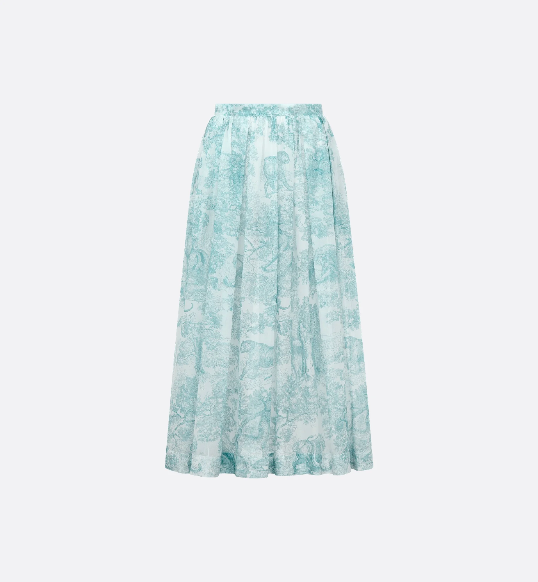 Part of the Dioriviera capsule, the mid-length skirt presents the Toile de Jouy Sauvage motif, a new take on the House's hallmark pattern. Made in white and lily of the valley green cotton muslin, it has a fluid, flared cut with side pockets. The mid-length skirt can be paired with other Dioriviera creations to complete the look. - Thin waistband - Side zip closure - Tonal lining - 100% cotton - Made in Italy Size & Fit - Flared cut - High waist - Mid-length - The model measures 177 cm / 69.5 inches and the item shown is in size 36 (FR) - Using our personalized tool will provide you with the best size recommendation - For more information, please review the size guide