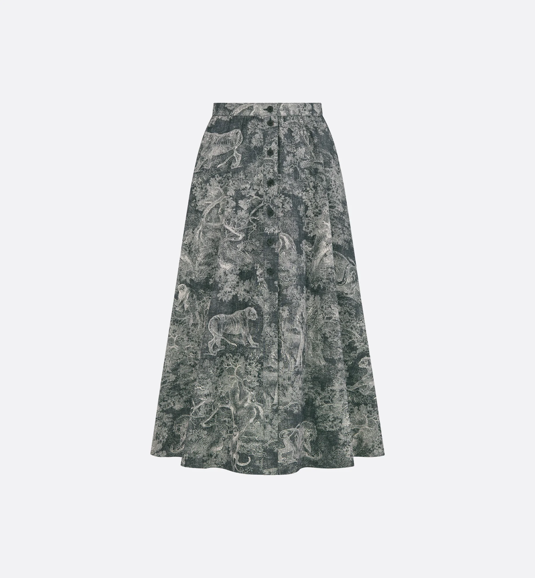 Part of the Dioriviera capsule, the mid-length skirt presents the Toile de Jouy Sauvage motif, a new take on the House's hallmark pattern. Made in deep blue and white cotton and silk poplin, it has a flared cut with side pockets and is accented by a front closure with horn buttons. The mid-length skirt can be paired with other Dioriviera creations to complete the look. - Thin waistband and pleats - Front button closure - Christian Dior Paris horn buttons - Unlined - 75% cotton, 25% silk - Made in Italy Size & Fit - Flared cut - Mid-length - Using our personalized tool will provide you with the best size recommendation - For more information, please review the size guide