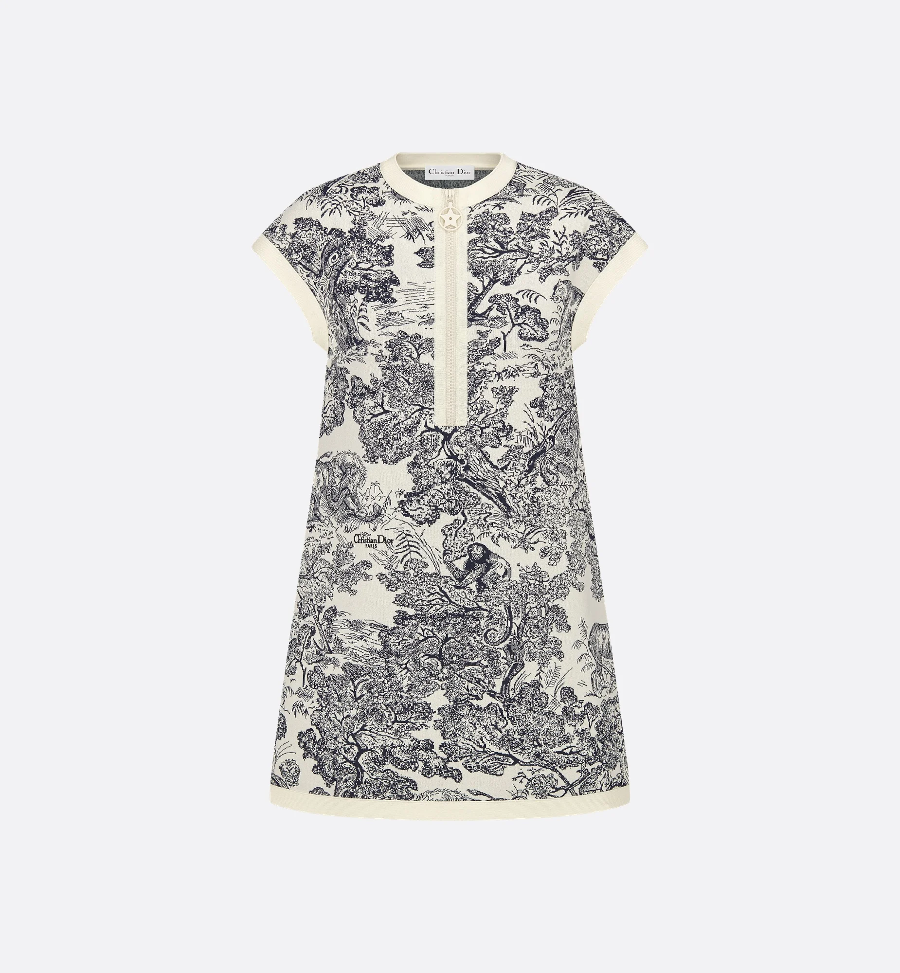 Part of the Dioriviera capsule, the short dress features a deep blue and white Toile de Jouy Sauvage motif, offering a new take on the House icon. Crafted in a technical knit, it is distinguished by a flared silhouette enhanced by a zipped neckline and embroidered Christian Dior Paris signature on the front. Completed by cap sleeves, the dress can be coordinated with other Dioriviera creations. - Embroidered Christian Dior Paris signature on the front - Zipped neckline with star zipper pull - Unlined - 83% viscose, 17% polyester (18 gauge)* - Made in Italy - Treat with extra care and gently dry clean Size & Fit - Flared cut - Short silhouette - Cap sleeves - Using our personalized tool will provide you with the best size recommendation - For more information, please review the size guide