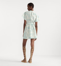 Part of the Dioriviera capsule, the short shirtdress showcases the white and lily of the valley green Toile de Jouy Sauvage motif, offering a new take on the hallmark House pattern. Crafted in cotton and silk poplin, it has a flared silhouette enhanced by an officer collar, tonal belt highlighting the waist and dolman cap sleeves. The shirtdress can be paired with other Dioriviera creations to complete the look. - Tonal belt - Front button closure - Christian Dior Paris horn buttons - Unlined - 74% cotton, 26% silk - Made in Italy Size & Fit - Flared cut - Short silhouette - Dolman cap sleeves - The model measures 177 cm / 69.5 inches and the item shown is in size 36 (FR) - Using our personalized tool will provide you with the best size recommendation - For more information, please review the size guide