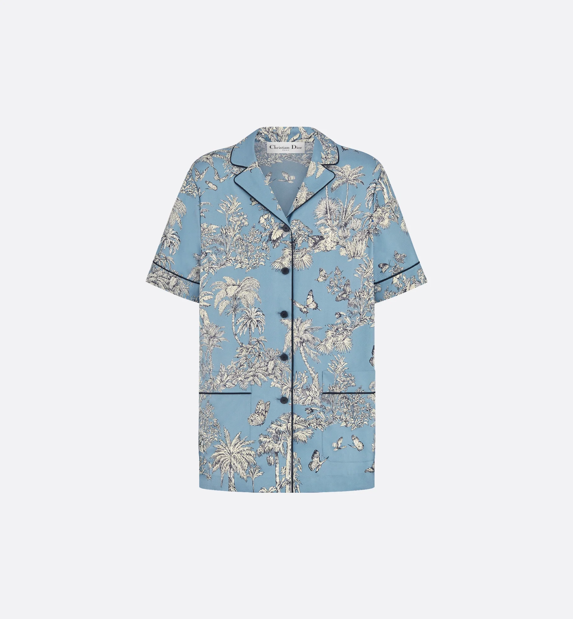 Part of the Dioriviera capsule, the shirt showcases Pietro Ruffo's Toile de Jouy Palms motif, capturing the beauty of nature with a vibrant jungle scene populated by diverse wildlife. Crafted in celestial blue and white silk twill, the design is embellished with black piping, creating an elegant contrast, while a button closure and two pockets adorn the front. The lightweight and refined short-sleeved shirt can be worn with other Toile de Jouy Palms creations to complete a Dioriviera look. - Black piping - Front button closure - Christian Dior Paris horn buttons - Unlined - 100% silk - Made in Italy Size & Fit - Relaxed fit - Short sleeves - We recommend ordering a size smaller than your regular size for a more comfortable fit - The model measures 178 cm / 70 inches and the item shown is in size 36 (FR) - Using our personalized tool will provide you with the best size recommendation - For more information, please review the size guide