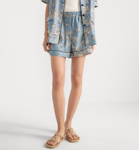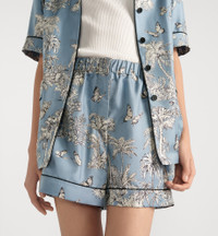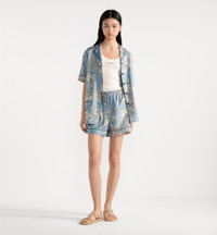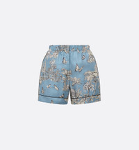 Part of the Dioriviera capsule, the shorts showcase Pietro Ruffo's Toile de Jouy Palms motif, capturing the beauty of nature with a vibrant jungle scene populated by diverse wildlife. Crafted in celestial blue and white silk twill, they feature black piping for an elegant contrast, as well as practical side pockets. The lightweight and refined shorts can be worn with other Toile de Jouy Palms creations to complete a Dioriviera look. - Black piping - Elastic waistband - Concealed front button closure - Unlined - 100% silk - Made in Italy Size & Fit - Loose fit - Size 34: waist size: 66 cm / 26 inches, hip circumference: 100 cm / 39.5 inches, front and rear length: 33 and 36 cm / 13 and 14 inches - Size 36: waist size: 70 cm / 27.5 inches, hip circumference: 102 cm / 40 inches, front and rear length: 33.5 and 36.5 cm / 13 and 14.5 inches - Size 38: waist size: 72 cm / 28.5 inches, hip circumference: 108 cm / 42.5 inches, front and rear length: 34 and 36 cm / 13.5 and 14 inches - Size 40: waist size: 76 cm / 30 inches, hip circumference: 112 cm / 44 inches, front and rear length: 34.5 and 37.5 cm / 13.5 and 15 inches - Size 42: waist size: 80 cm / 31.5 inches, hip circumference: 114 cm / 45 inches, front and rear length: 35 and 38 cm / 14 and 15 inches - Size 44: waist size: 84 cm / 33 inches, hip circumference: 120 cm / 47 inches, front and rear length: 35 and 38 cm / 14 and 15 inches - Size 46: waist size: 86 cm / 34 inches, hip circumference: 124 cm / 49 inches, front and rear length: 36 and 39 cm / 14 and 15.5 inches - Each measurement may have a normal variation of 2 cm / 0.75 inch - The model measures 178 cm / 70 inches and the item shown is in size 36 (FR) - Using our personalized tool will provide you with the best size recommendation - For more information, please review the size guide