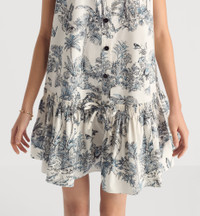 Part of the Dioriviera capsule, the short dress showcases Pietro Ruffo's white and blue Toile de Jouy Palms motif, capturing the beauty of nature with a vibrant jungle scene populated with diverse wildlife. Crafted in cotton and silk poplin, it features a slightly flared silhouette enhanced by a ruffled hem for a touch of lightness. The dress can be coordinated with other Toile de Jouy Palms designs to complete a Dioriviera look. - Front button closure - Christian Dior Paris horn buttons - Unlined - 71% cotton, 29% silk - Made in Italy Size & Fit - Slightly flared straight cut - Short silhouette - Sleeveless - The model measures 178 cm / 70 inches and the item shown is in size 36 (FR) - Using our personalized tool will provide you with the best size recommendation - For more information, please review the size guide