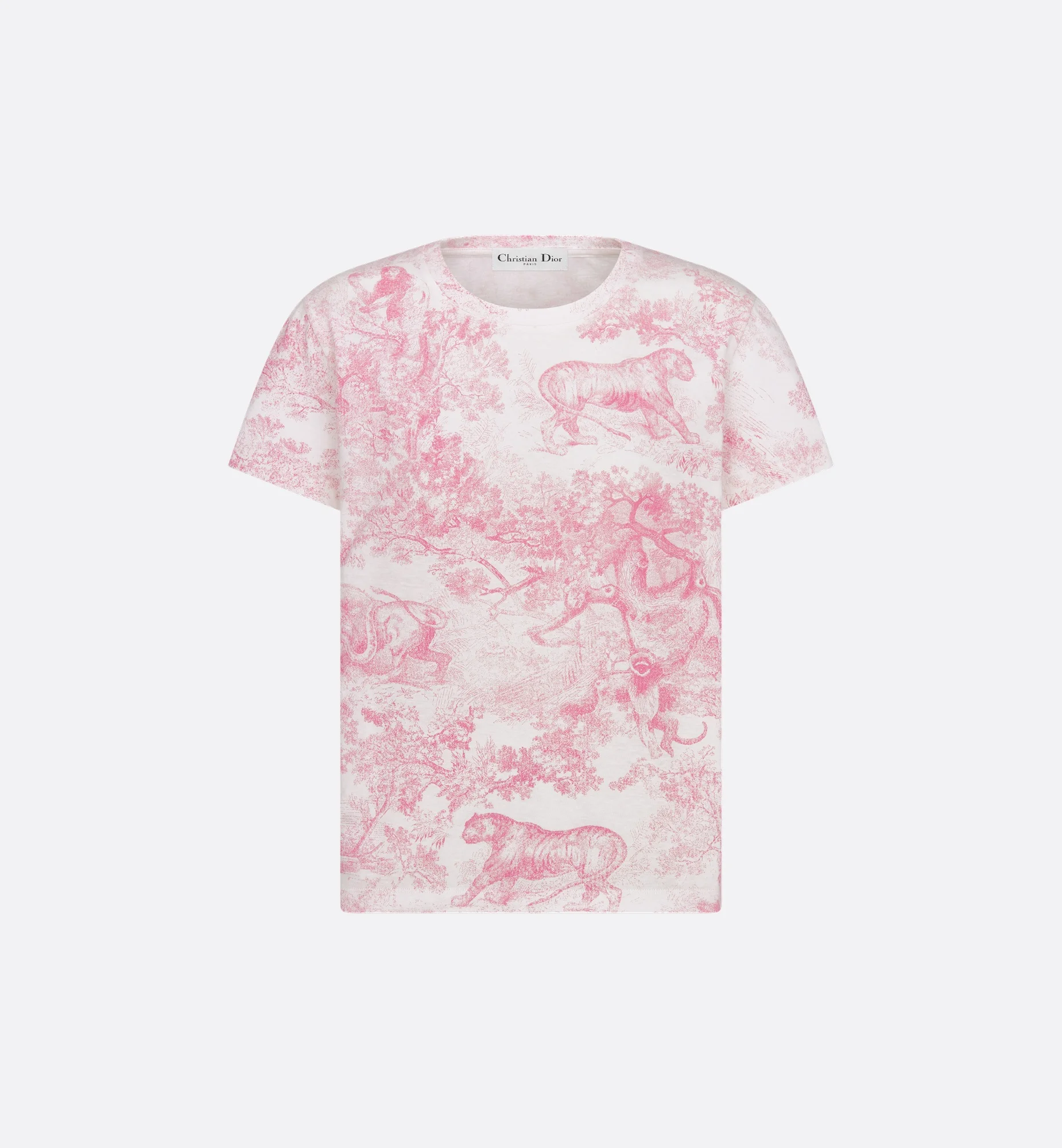 Part of the Dioriviera capsule, the T-shirt presents the Toile de Jouy Sauvage motif in white and cherry blossom pink, a new take on the signature House pattern. Crafted in cotton and linen jersey, the regular-fit, crew neck design is adorned with a hallmark bee and CD signature on the back. The T-shirt can be styled with other Dioriviera creations to complete the look. - Hallmark bee and CD signature on the back - Unlined - 85% cotton, 15% linen - Made in Italy - Treat with extra care and gently dry clean Size & Fit - Regular fit - Size XS: shoulder-to-shoulder width: 39 cm / 15.5 inches, chest size: 84 cm / 33 inches, outside and inside sleeve lengths: 19 and 7 cm / 7.5 and 3 inches, garment length: 61 cm / 24 inches - Size S: shoulder-to-shoulder width: 40 cm / 15.5 inches, chest size: 88 cm / 34.5 inches, outside and inside sleeve lengths: 19 and 7 cm / 7.5 and 3 inches, garment length: 62 cm / 24.5 inches - Size M: shoulder-to-shoulder width: 41 cm / 16 inches, chest size: 92 cm / 36 inches, outside and inside sleeve lengths: 19.5 and 7 cm / 7.5 and 3 inches, garment length: 63 cm / 25 inches - Size L: shoulder-to-shoulder width: 42 cm / 16.5 inches, chest size: 96 cm / 38 inches, outside and inside sleeve lengths: 20 and 7 cm / 8 and 3 inches, garment length: 64 cm / 25 inches - Size XL: shoulder-to-shoulder width: 43 cm / 17 inches, chest size: 100 cm / 39.5 inches, outside and inside sleeve lengths: 20.5 and 7 cm / 8 and 3 inches, garment length: 65 cm / 25.5 inches - Each measurement may have a normal variation of 2 cm / 0.75 inch - The model measures 178 cm / 70 inches and the item shown is in size S (FR) - Using our personalized tool will provide you with the best size recommendation - For more information, please review the size guide