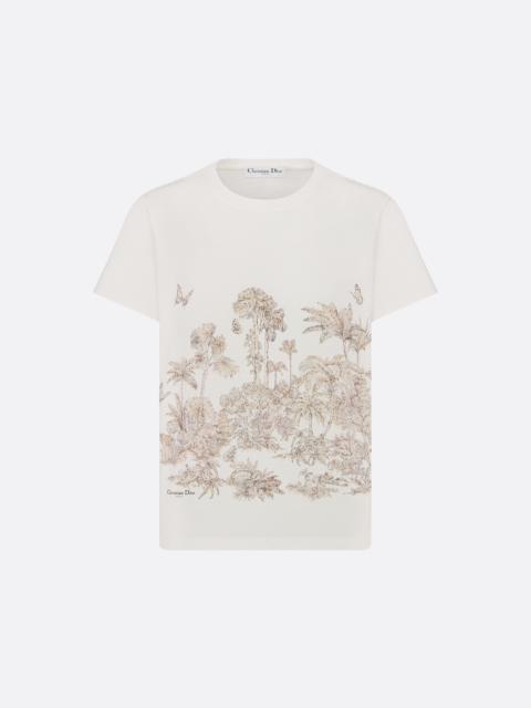 Part of the Dioriviera capsule, the cotton and linen jersey T-shirt showcases Pietro Ruffo's white and blue Toile de Jouy Palms motif, capturing the beauty of nature with a vibrant jungle scene populated with diverse wildlife. The classic crew-neck design is enhanced by the Christian Dior Paris signature on the front. The T-shirt can be coordinated with other Dioriviera creations. - Christian Dior Paris signature on the front - Unlined - 85% cotton, 15% linen - Made in Italy - Treat with extra care and gently dry clean Size & Fit - Regular fit - Short sleeves - Using our personalized tool will provide you with the best size recommendation - For more information, please review the size guide