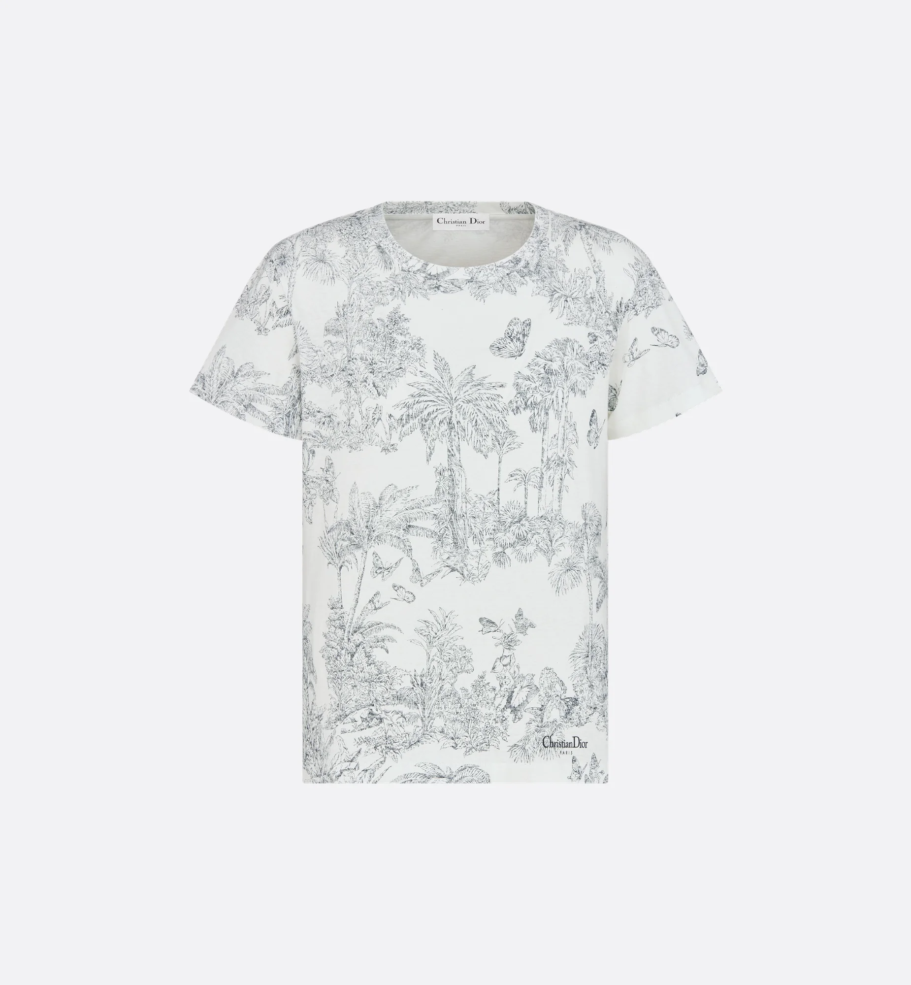 Part of the Dioriviera capsule, the cotton and linen jersey T-shirt showcases Pietro Ruffo's white and blue Toile de Jouy Palms motif, capturing the beauty of nature with a vibrant jungle scene populated with diverse wildlife. The classic crew-neck design is enhanced by the Christian Dior Paris signature on the front. The T-shirt can be coordinated with other Dioriviera creations. - Christian Dior Paris signature on the front - Unlined - 85% cotton, 15% linen - Made in Italy - Treat with extra care and gently dry clean Size & Fit - Regular fit - Short sleeves - The model measures 178 cm / 70 inches and the item shown is in size S (FR) - Using our personalized tool will provide you with the best size recommendation - For more information, please review the size guide