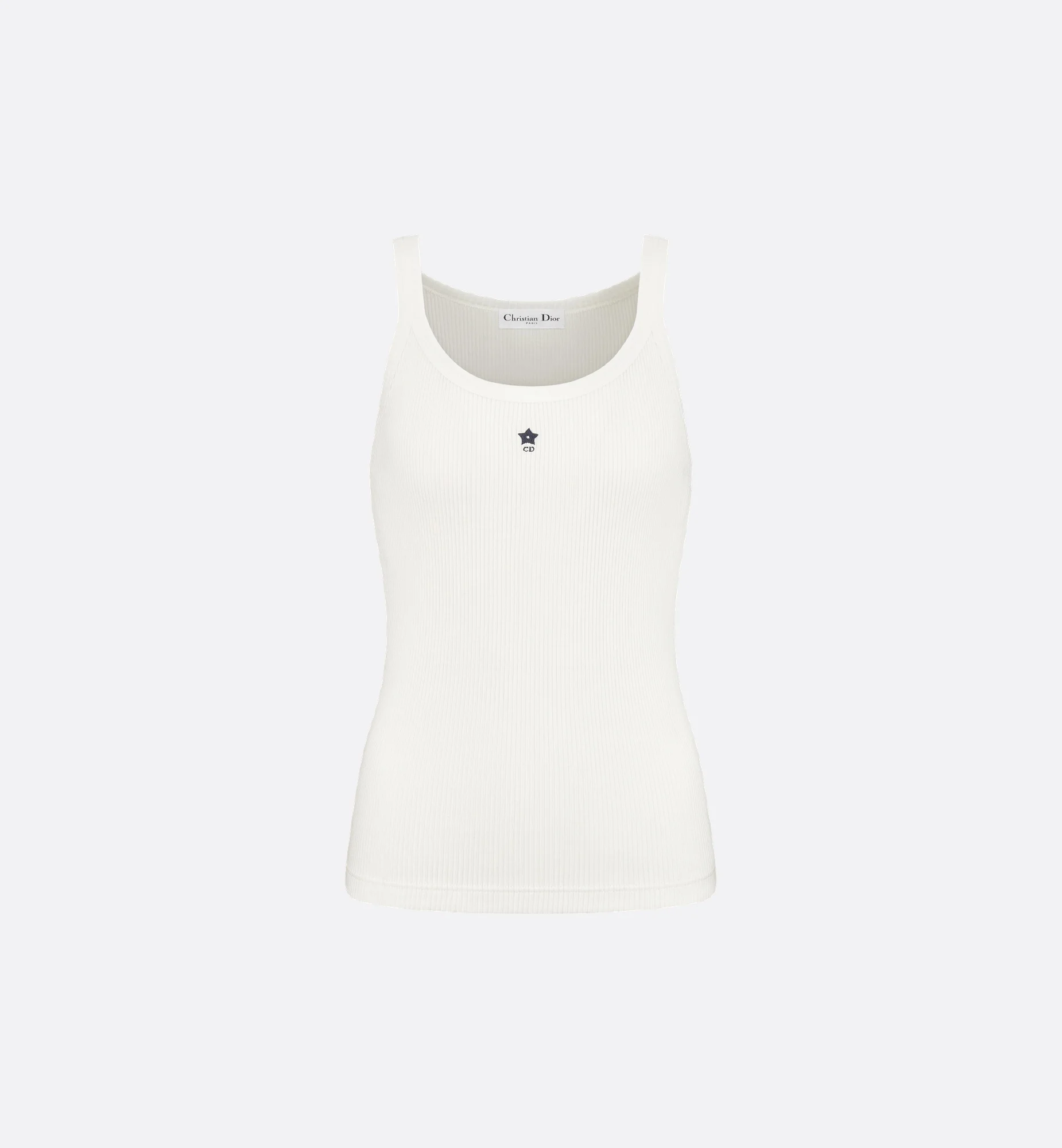 Part of the Dioriviera capsule, the white ribbed cotton jersey tank top is a timeless piece. The fitted silhouette with thin straps is embroidered with the hallmark navy blue star and CD signature on the front. The tank top will coordinate with any look from the Dioriviera capsule. - Embroidered star and CD signature on the front - Unlined - 100% cotton - Made in Italy - Treat with extra care and gently dry clean Size & Fit - Fitted silhouette - Sleeveless - The model measures 177 cm / 70 inches and the item shown is in size S (FR) - Using our personalized tool will provide you with the best size recommendation - For more information, please review the size guide