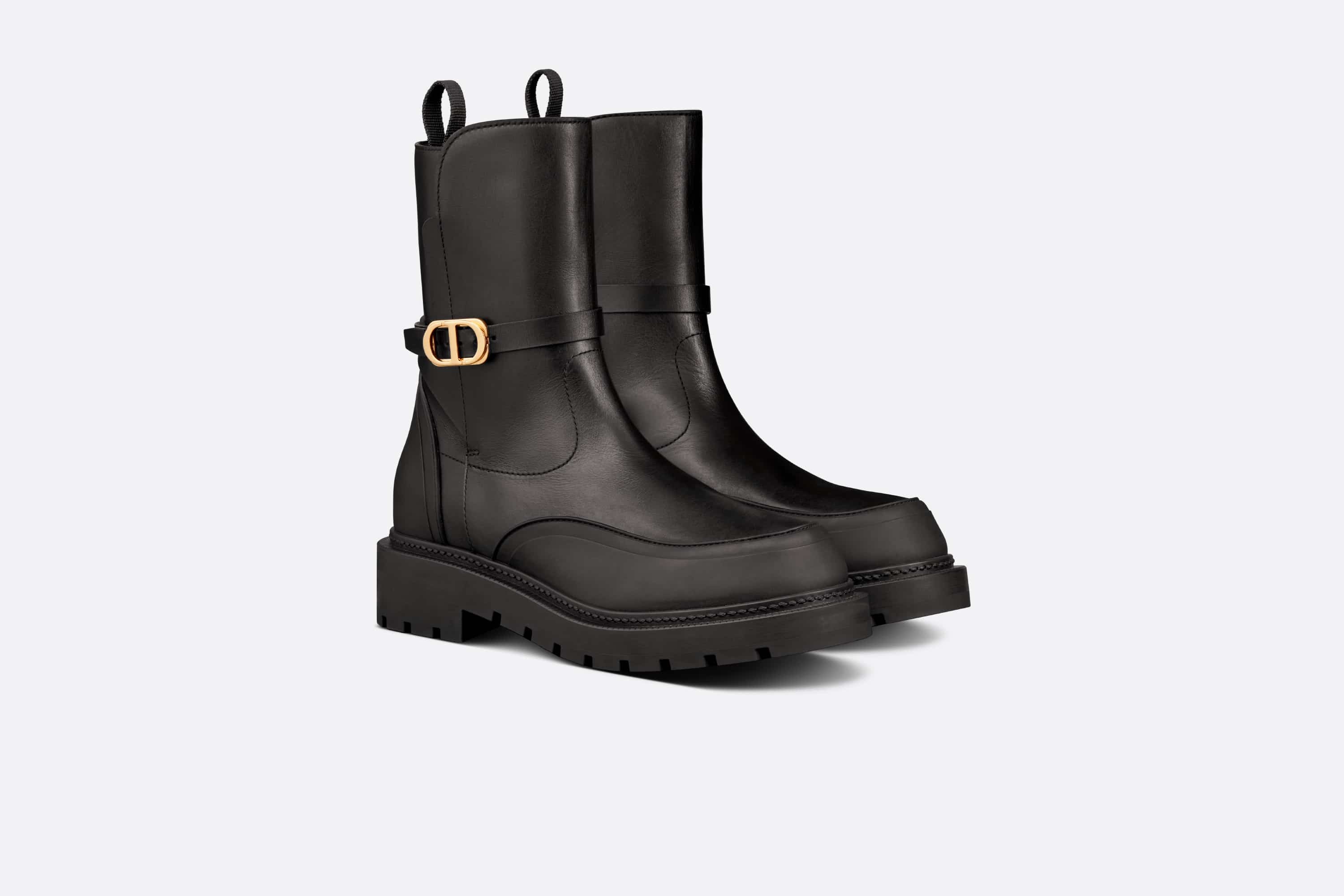 The Dior Empreinte ankle boot presents modern allure and a bold look. The black calfskin upper is completed by a heel tab, round toe, and thick notched rubber sole. The ankle strap adorned with a gold-finish 'CD' buckle and hallmark bee in the back complete the ankle boot. - Adjustable sliding strap with 'CD' signature - Bee and 'CD' signature at the back - Notched rubber sole with star, Christian Dior's lucky symbol - Made in Italy Size & Fit - The upper is 19.5 cm / 7.5 inches in the front and 18 cm / 7 inches in the back - The style fits true to size: we recommend ordering your normal shoe size - For those with wider feet, we recommend ordering a half-size larger than your normal size - For more information, please review the size guide