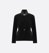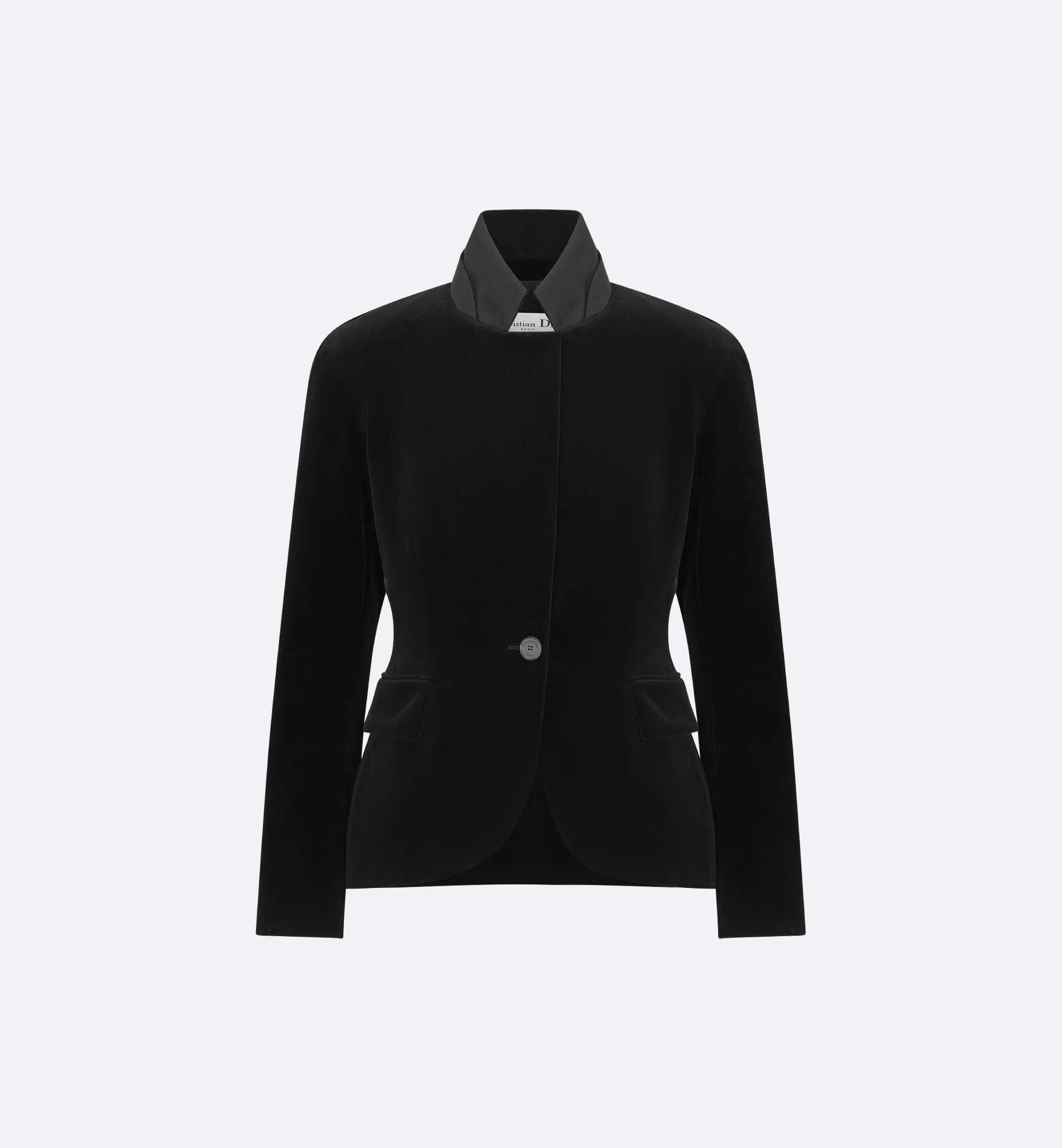 Revealed at the Autumn-Winter 2025-2026 Fashion Show, the timeless jacket is revisited with the House's couture spirit. Constructed in black cotton velvet, it is enhanced by a collar that can be turned up. Flap pockets define the waist with a refined, tailored touch, while the curved hem accentuates its elegant lines. The jacket will pair well with a ruffled blouse and the matching Bermuda shorts for a couture look. - Front button closure - Christian Dior Paris signature horn button - Tonal lining - 100% cotton and lining: 100% silk - Made in France Size & Fit - Fitted silhouette - Long sleeves - Using our personalized tool will provide you with the best size recommendation - For more information, please review the size guide