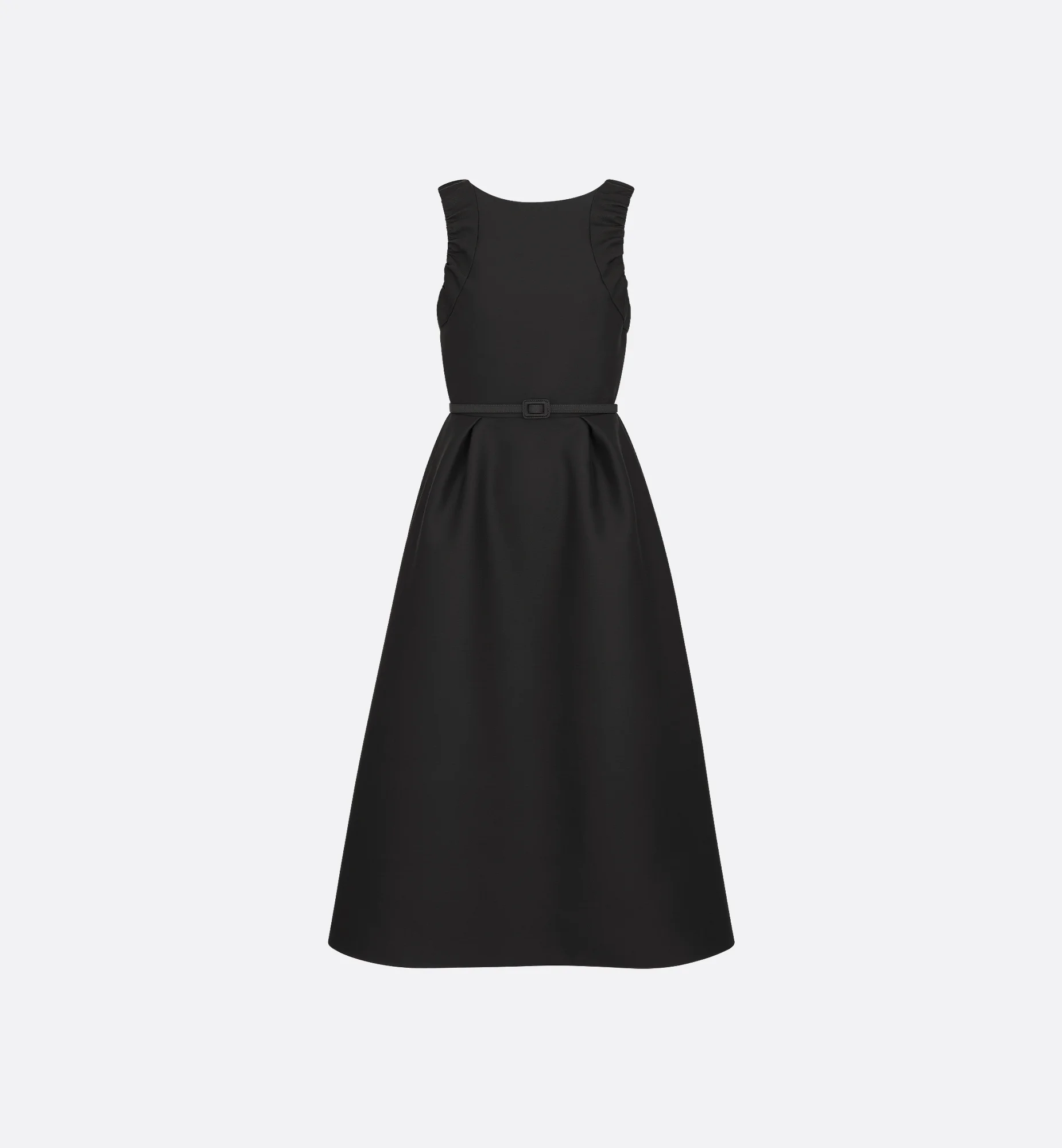 The mid-length dress embodies modern elegance. Crafted in black wool and silk shantung, it is distinguished by a flared silhouette elevated by a tonal belt highlighting the waist. The dress will create a contemporary and refined look. - Tonal belt - Zip closure on the back - Tonal lining - 84% wool, 16% silk and lining: 100% silk - Made in France Size & Fit - Flared cut - Mid-length - Sleeveless - Using our personalized tool will provide you with the best size recommendation - For more information, please review the size guide