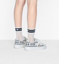 The white technical fabric Dior-ID sneaker has a modern look. The textured-effect French blue 'CHRISTIAN DIOR PARIS' signature adorns the rear. It features contrasting stitching and a textured rubber insert conceals the laces, while the side pull tab is embellished with a gold-tone 'DIOR-ID' signature. The sturdy-sole sneaker lends a contemporary touch to any look. - 'DIOR-ID' signature adhesive tongue - 'CHRISTIAN DIOR PARIS' signature print with a 3D effect - Upper covered in a translucent mesh with rubber inserts - Notched rubber sole with star, Christian Dior's lucky symbol - Made in Italy Size & Fit - The style fits true to size: we recommend ordering your normal shoe size - For those with wider feet, we recommend ordering a half-size larger than your normal size - For more information, please view the size guide