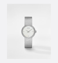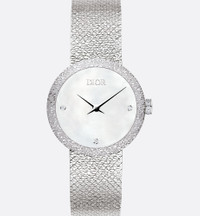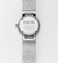 Featuring a Milanese mesh bracelet, the La D de Dior Satine watch translates the supple and luminous qualities of a fine silk ribbon into the language of watchmaking. - Case: 25 mm (1) stainless steel - Steel bezel featuring a satin motif - Steel crown set with 13 brilliant-cut diamonds (0.03 ct*) - Water resistant: 30 meters (98 feet) - White mother-of-pearl dial set with 3 brilliant-cut diamond indices (0.02 ct*) - Polished dauphine hands - Anti-glare sapphire crystal - Milanese stainless steel bracelet - Steel folding clasp - Quartz movement - Functions: Hours – Minutes - Two-year warranty - Made in Switzerland - *The stone weights are based on average weights only.