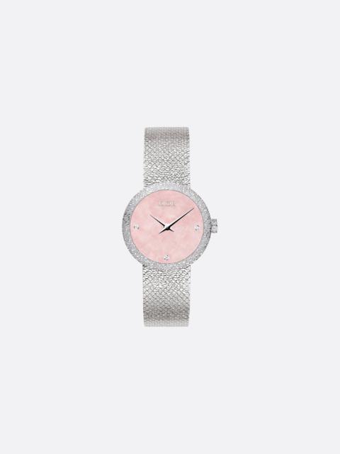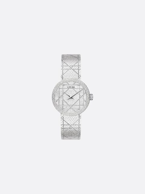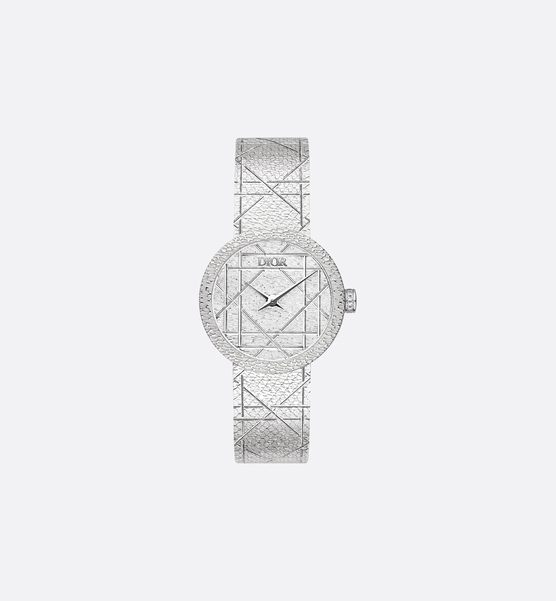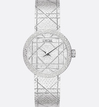 To celebrate 20 years of la D de Dior, created in 2003, the precious dial and bracelet of this House icon are adorned with geometric Cannage lines in honor of the motif so dear to Mr. Dior. - Case: 25 mm (1) steel - Stainless steel bezel - Steel crown set with 13 brilliant-cut diamonds (0.03 ct) - Water resistant: 30 meters (98 feet) - Cannage-engraved satin motif dial - Polished dauphine hands - Anti-glare sapphire crystal - Milanese stainless steel bracelet with satin motif and Cannage engraving, unfolding steel buckle - Quartz movement - Functions: Hours – Minutes - Two-year warranty - Made in Switzerland