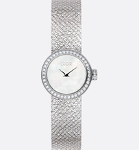 Featuring a Milanese mesh bracelet, the La Mini D de Dior Satine watch translates the supple and luminous qualities of a fine silk ribbon into the language of watchmaking. - Case: 19 mm (0.7) stainless steel - Steel bezel set with 40 brilliant-cut diamonds (0.32 ct*) - CD-engraved steel crown set with 13 brilliant-cut diamonds (0.03 ct*) - Water resistant: 30 meters (98 feet) - White mother-of-pearl dial - Polished dauphine hands - Anti-glare sapphire crystal - Milanese stainless steel bracelet - Steel folding clasp - Quartz movement - Functions: Hours – Minutes - Two-year warranty - Made in Switzerland - *The stone weights are based on average weights only.