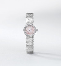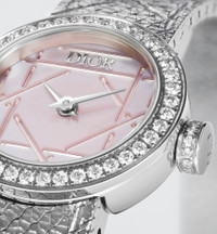 La D My Dior features the graphic lines of Mr. Dior's cherished Cannage motif, showcasing a geometric interplay on the hand-engraved bracelet and the mother-of-pearl dial. - Case: 19 mm (0.7) stainless steel - Stainless steel bezel set with 40 brilliant-cut diamonds (0.32 ct) - Steel crown set with 13 brilliant-cut diamonds (0.03 ct) - Water resistant: 30 meters (98 feet) - Pink Cannage-engraved mother-of-pearl dial, with silver-finish metal - Polished dauphine hands - Anti-glare sapphire crystal - Milanese stainless steel bracelet with satin motif and Cannage engraving, steel folding clasp - Quartz movement - Functions: Hours – Minutes - Two-year warranty - Made in Switzerland