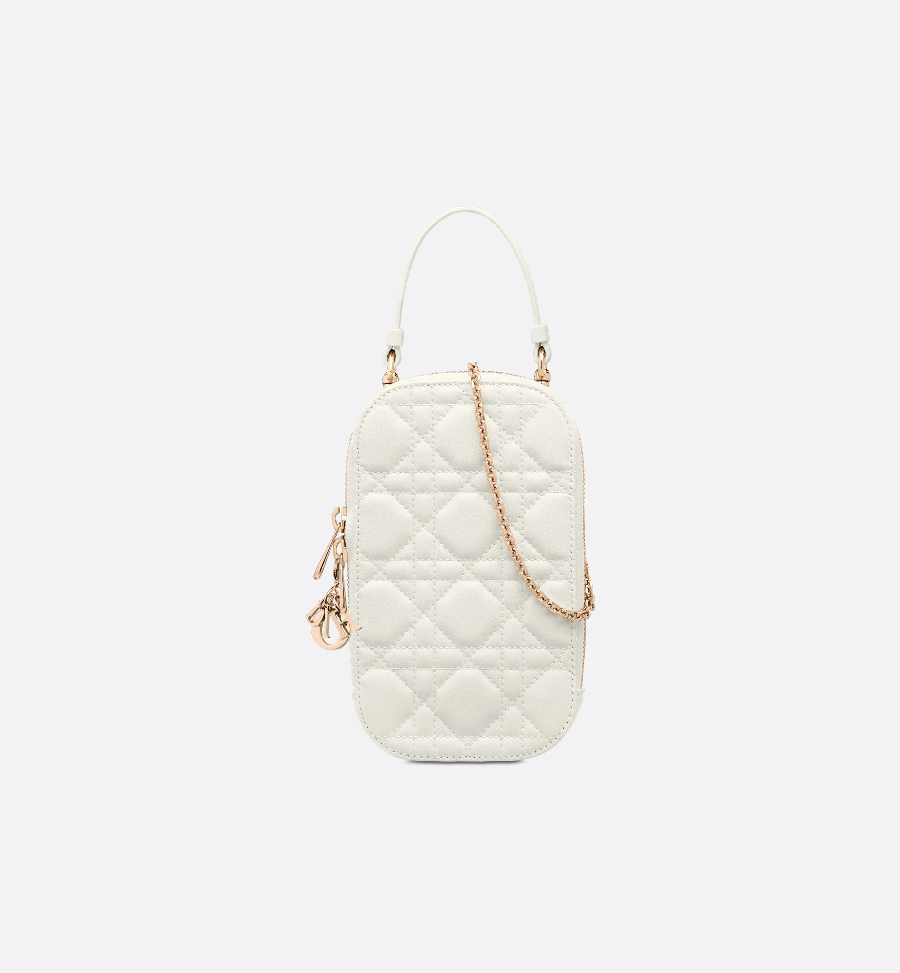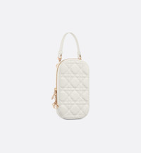 The Lady Dior Call'in Dior phone holder is both sophisticated and ingenious. Crafted in latte Cannage lambskin, the accessory features detachable D.I.O.R. charms. The phone holder may be carried by hand or worn crossbody thanks to its removable handle and chain strap. - Detachable D.I.O.R. charms - Two-way zip closure - Removable leather top handle - Removable chain strap - Three card slots - Made in Italy Size & Fit - Dimensions: 10.5 x 18 x 2.5 cm / 4 x 7 x 1 inches (Length x Height x Width) - The size is suitable for a phone and a card holder - Chain length: 120 cm / 47 inches - Chain drop length: 57 cm / 22.5 inches