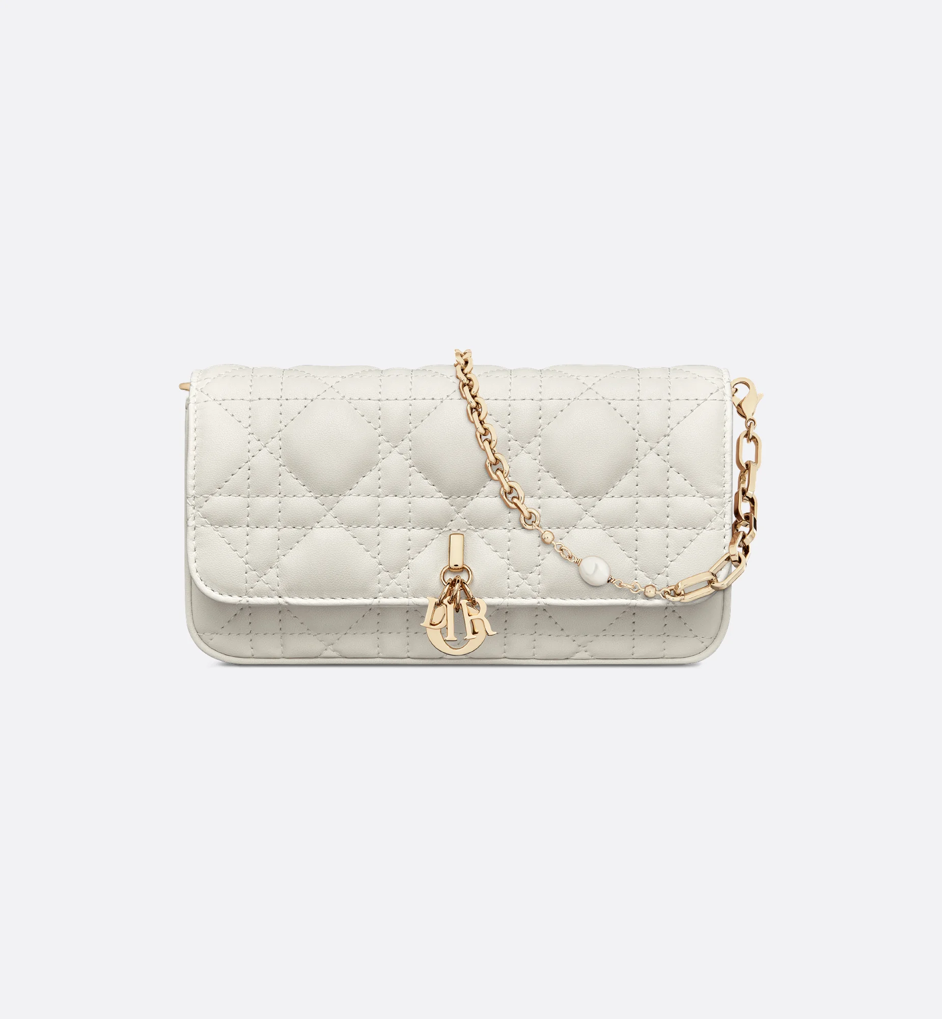 The My Dior - Dior Talk Phone Pouch is a clever and sophisticated creation. Crafted in latte Cannage lambskin, it features pale gold-finish metal D.I.O.R. charms. Completed by an elegant removable chain punctuated with resin pearls, the phone pouch can be carried by hand, worn over the shoulder or crossbody. - Front D.I.O.R. charms - Removable chain strap - Two card slots - Made in Italy Size & Fit - Dimensions: 18.5 x 10 x 4 cm / 7.5 x 4 x 1.5 inches (Length x Height x Width) - The size is suitable for a phone and a card holder