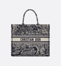 Introduced by Maria Grazia Chiuri, Creative Director of Christian Dior, the Dior Book Tote has become a staple of the Dior aesthetic. Designed to hold all the daily essentials, the style is fully embroidered with a blue and ecru Toile de Jouy Reverse motif, a variation of the House's hallmark pattern with a play on reversed colors. Adorned with the Christian Dior Paris signature on the front, the large tote exemplifies the House's signature savoir-faire and may be carried by hand or worn over the shoulder. - Main composition: cotton - Cotton and calfskin lining - Christian Dior Paris signature on the front - Dust bag included - Made in Italy Size & Fit - Dimensions: 42 x 35 x 18.5 cm / 16.5 x 14 x 7.5 inches (Length x Height x Width) - The bag's large size can accommodate a 15-inch laptop, a pouch, a wallet, a phone, a card holder, sunglasses and lipstick - Handle length: 42.5 cm / 16.5 inches - Handle drop length: 16 cm / 6.5 inches - Weight: 838 g / 29.5 ounces