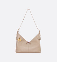 New for Cruise 2026, the Dior Voyage bag combines soft lines with sophisticated details for a harmonious hobo silhouette. The powder beige grained calfskin leatherwork showcases Flat Macrocannage topstitching in an interpretation of the House's iconic motif. The supple construction is enhanced by antique gold-finish metal D.I.O.R. charms and finely crafted leather accents for added structure, while the main compartment has a secure and practical two-way zip closure. Featuring a top handle with adjustable buckles, the large bag can be worn over the shoulder as a daily companion. - Main composition: calfskin - Cotton, linen and calfskin lining - Two-way zip closure - D.I.O.R. charms - Adjustable leather top handle with antique gold-finish metal buckles - Interior zip pocket - Dust bag included - Made in Italy Size & Fit - Dimensions: 34 x 22 x 13 cm / 13.5 x 8.5 x 5 inches (Length x Height x Width) - The size is suitable for a pouch, a wallet, a phone, a card holder, sunglasses and lipstick - Size and weight details may vary depending on the product's material