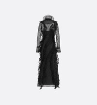 Unveiled at the Autumn-Winter 2025-2026 Fashion Show, the long dress is distinguished by its couture appeal. Made in black linen-, silk- and cotton-blend knit lace, it features an elegant regular fit enhanced by the collection's hallmark removable ruched collar, and asymmetric ruffled detailing accentuating the silhouette. The dress will define a refined, sophisticated look. - Removable ruched collar - Christian Dior Paris mother-of-pearl buttons - Ruffle details - Removable tonal lining - 41% linen, 39% polyester, 12% silk, 8% cotton (12 gauge)* - Made in Italy - Treat with extra care and gently dry clean Size & Fit - Regular fit - Floor length - Long sleeves - Using our personalized tool will provide you with the best size recommendation - For more information, please review the size guide