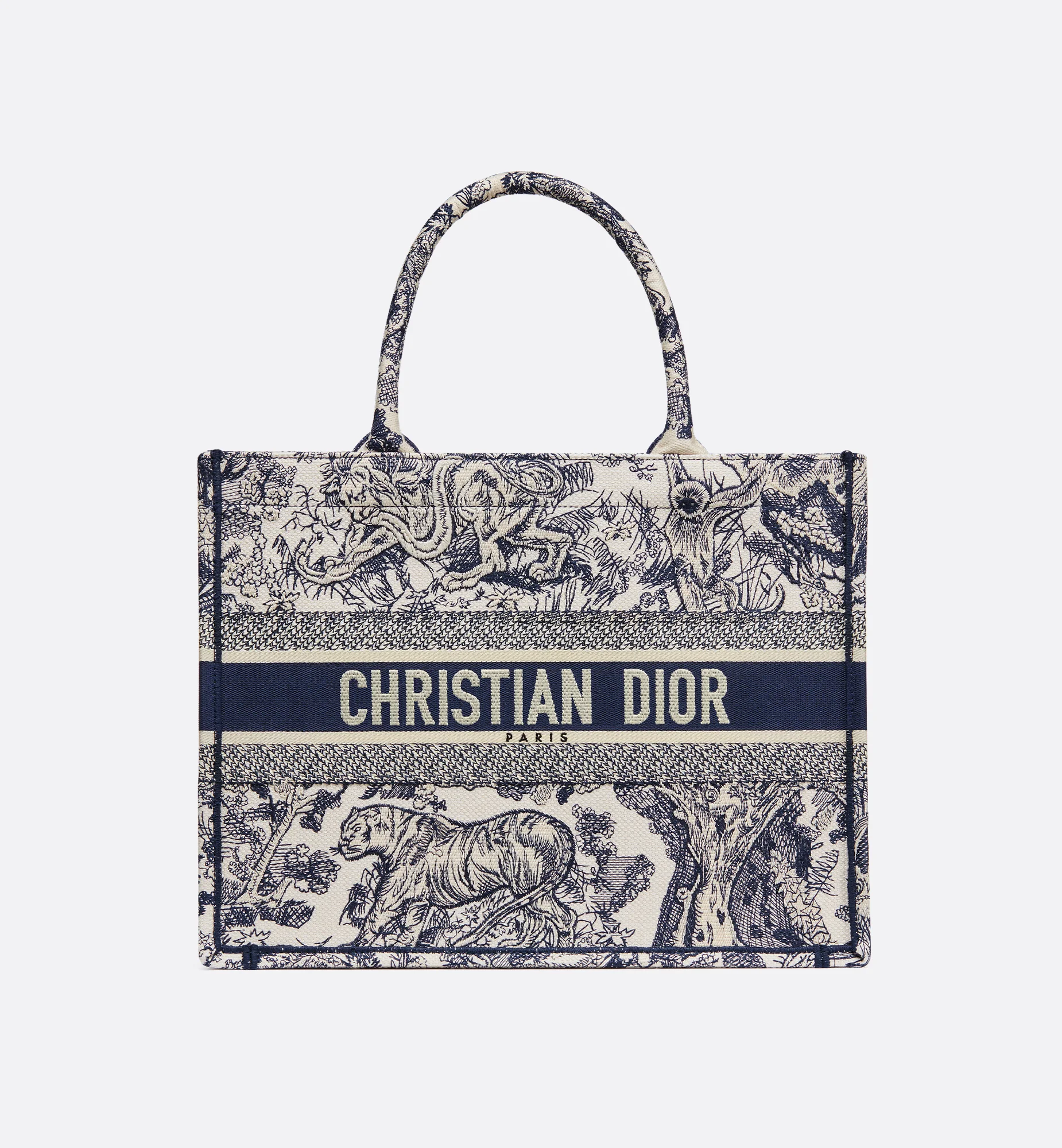 Introduced by Maria Grazia Chiuri, Creative Director of Christian Dior, the Dior Book Tote has become a staple of the Dior aesthetic. Designed to hold all the daily essentials, the style is fully embroidered with the ecru and blue Toile de Jouy motif enhanced by the Christian Dior Paris signature on the front. The medium tote exemplifies the House's signature savoir-faire and may be carried by hand or worn over the shoulder. - Christian Dior Paris signature on the front - Dust bag included - Made in Italy Size & Fit - Dimensions: 36 x 27.5 x 16.5 cm / 14 x 11 x 6.5 inches (Length x Height x Width) - The bag's large size can accommodate a 15-inch laptop, a pouch, a wallet, a phone, sunglasses and lipstick - Handle length: 42 cm / 16.5 inches - Handle drop length: 16 cm / 6.5 inches - Weight: 600 g / 21 ounces