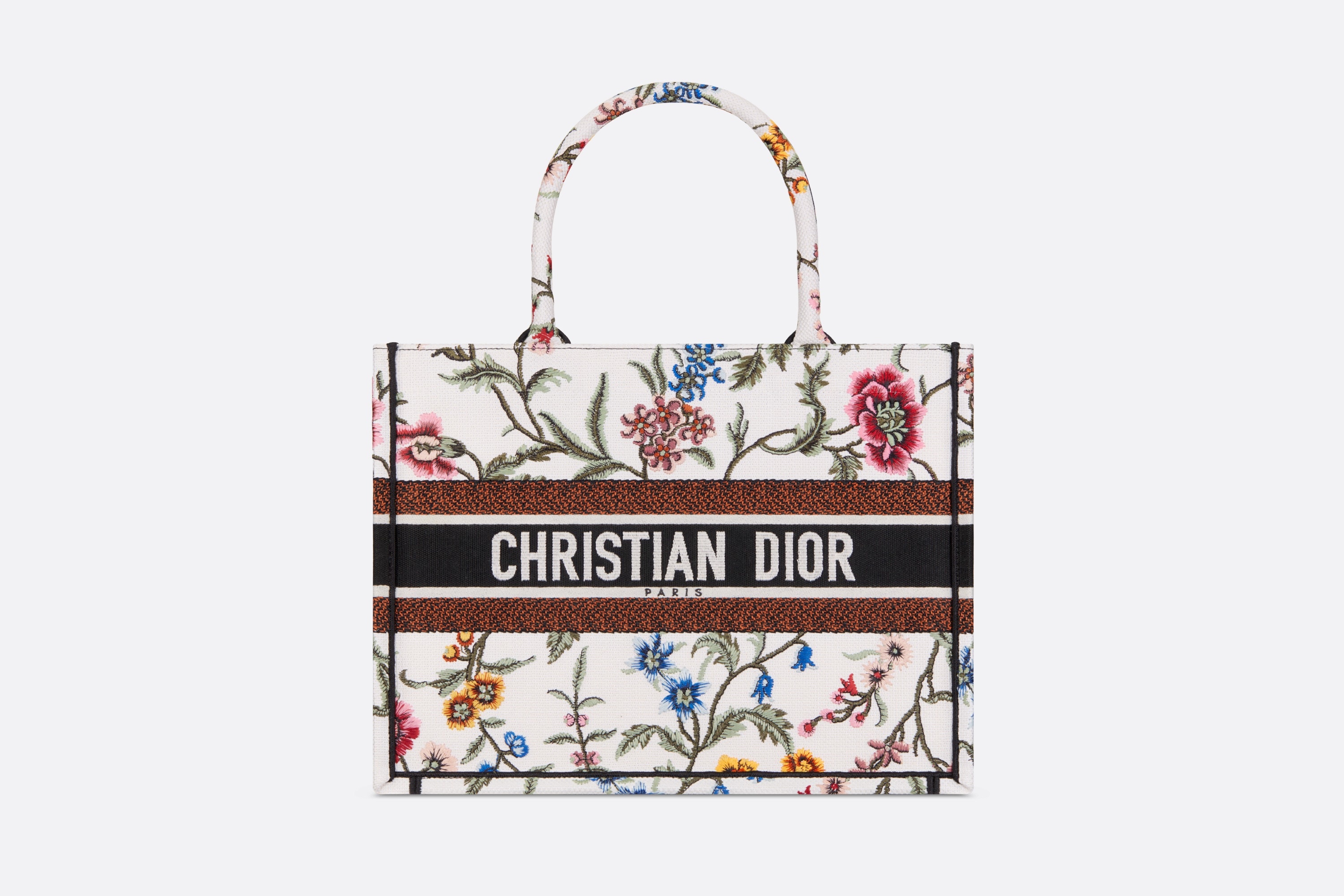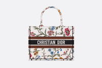 Introduced by Maria Grazia Chiuri, Creative Director of Christian Dior, the Dior Book Tote has become a staple of the Dior aesthetic. Designed to hold all daily essentials, the style is fully embroidered with a white multicolor Dior Petites Fleurs motif, a romantic and vibrant homage to Mr. Dior's passion for florals. Adorned with the Christian Dior Paris signature on the front, the medium tote exemplifies the House's signature savoir-faire and may be carried by hand or worn over the shoulder. - Christian Dior Paris signature on the front - Dust bag included - Made in Italy Size & Fit - Dimensions: 36 x 27.5 x 16.5 cm / 14 x 11 x 5.5 inches - The size is suitable for a 16-inch laptop computer