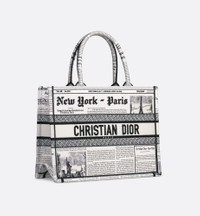 The Dior Book Tote has become a staple of the Dior aesthetic. Designed to hold all the daily essentials, the style is fully embroidered with a white and black Newspaper motif, inspired by House archives. Adorned with the Christian Dior Paris signature on the front, the medium tote exemplifies the House's signature savoir-faire and may be carried by hand or worn over the shoulder. - Main composition: cotton - Christian Dior Paris signature on the front - Dust bag included - Made in Italy Size & Fit - Dimensions: 36 x 27.5 x 16.5 cm / 14 x 11 x 6.5 inches (Length x Height x Width) - The bag's large size can accommodate a 15-inch laptop, a pouch, a wallet, a phone, sunglasses and lipstick - Top handle length: 42 cm / 16.5 inches - Top handle drop length: 16 cm / 6.5 inches - Weight: 650 g / 23 ounces - Size and weight details may vary depending on the product's material