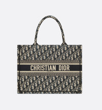 Introduced by Maria Grazia Chiuri, Creative Director of Christian Dior, the Dior Book Tote has become a staple of the Dior aesthetic. Designed to hold all the daily essentials, the style is fully embroidered with the ecru and blue Dior Oblique motif. Adorned with the Christian Dior Paris signature on the front, the medium tote exemplifies the House's signature savoir-faire and may be carried by hand or worn over the shoulder. - Main composition: cotton - Cotton and calfskin lining - Christian Dior Paris signature on the front - Dust bag included - Made in Italy Size & Fit - Dimensions: 36 x 27.5 x 16.5 cm / 14 x 11 x 6.5 inches (Length x Height x Width) - The bag's large size can accommodate a 15-inch laptop, a pouch, a wallet, a phone, sunglasses and lipstick - Handle length: 42 cm / 16.5 inches - Handle drop length: 16 cm / 6.5 inches - Weight: 656 g / 23 ounces