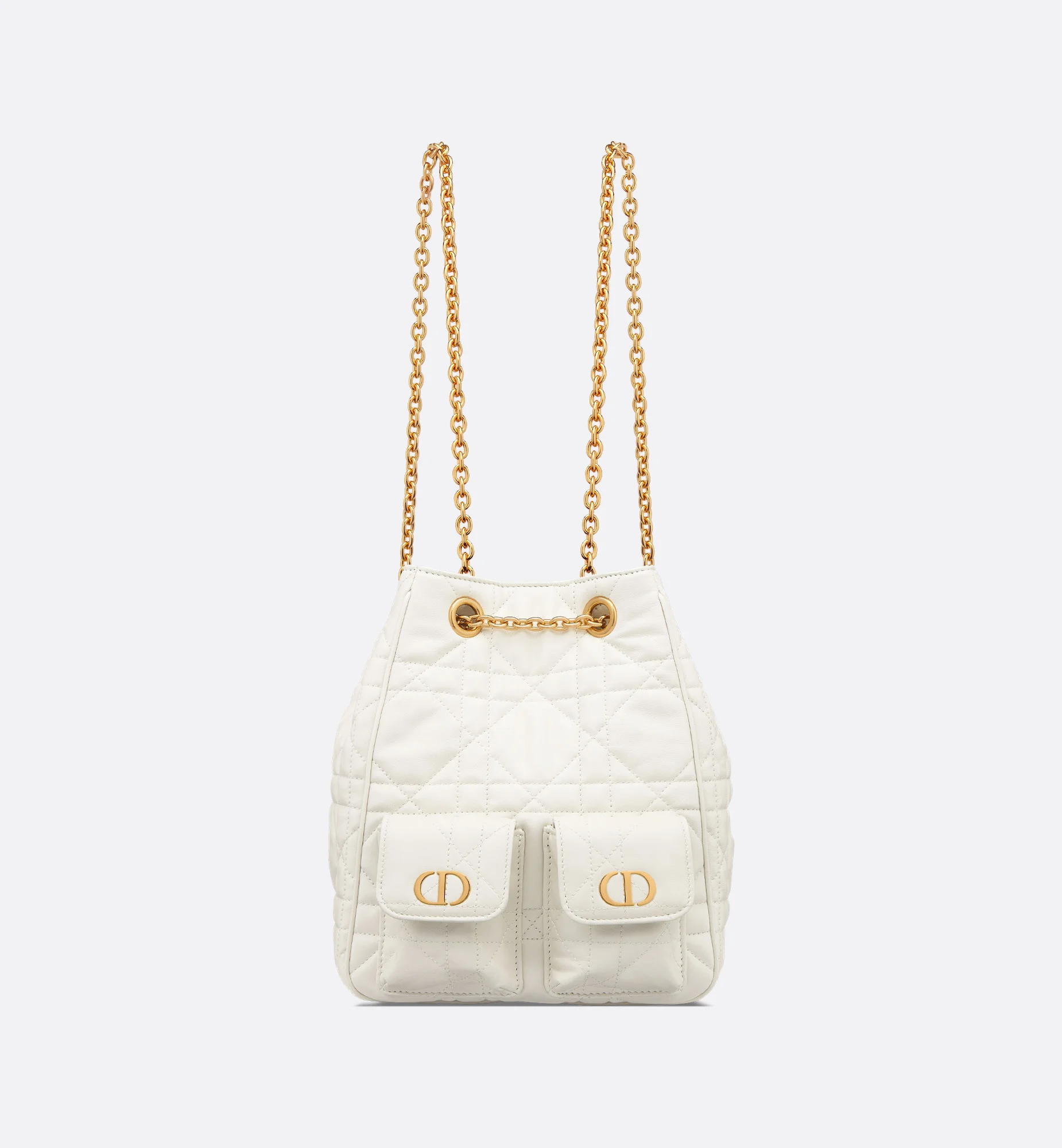 New for Winter 2025, the Dior Caro Multicarry backpack embodies modern and elegant style. Crafted in latte lambskin with Macrocannage topstitching, the versatile creation stands out with a streamlined silhouette that opens to reveal a spacious main compartment with a magnetic closure, completed by two small flap pockets adorned with a gold-finish metal CD signature on the front. Featuring a chain with a sliding design and leather inserts, the medium bag can be carried comfortably as a backpack or worn over the shoulder using the double chain strap. - Main composition: lambskin - Calfskin lining - CD signatures on the front - Magnetic closure - Adjustable chain with leather inserts - Front magnetic flap pockets - Interior zip pocket - Dust bag included - Made in Italy Size & Fit - Dimensions: 21 x 25 x 14 cm / 8.5 x 10 x 5.5 inches (Length x Height x Width) - The size is suitable for a phone, a wallet, a card holder, sunglasses and lipstick - Strap length: 79.5 – 85.5 cm / 31.5 – 33.5 inches - Drop length: 35 – 39 cm / 14 – 15.5 inches - Weight: 630 g / 22 ounces - Size and weight details may vary depending on the product's material