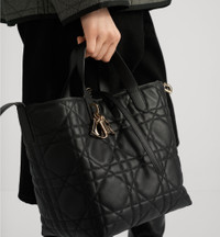 The Dior Toujours vertical tote bag is distinguished by a modern and practical design. Crafted in black calfskin with Macrocannage topstitching, it has a spacious interior compartment to accommodate all the essentials. Its thin leather strap closure keeps items secure, while the D of the CD Lock clasp twists to adjust the sides and enhance the bag's silhouette. The leather top handles are completed by a removable leather strap, allowing the medium bag to be carried by hand, worn over the shoulder or crossbody. - Main composition: calfskin - Calfskin lining - Double closure: a thin lace-through strap and a Christian Dior Paris strap with a CD Lock clasp - D.I.O.R. charms - Interior slip pocket for cards - Leather top handles - Removable leather shoulder strap - Dust bag included - Made in Italy Size & Fit - Dimensions: 20 x 22 x 18.5 cm / 8 x 8.5 x 7.5 inches (Length x Height x Width) - The size is suitable for two wallets, a phone, two card holders, sunglasses and lipstick - Size and weight details may vary depending on the product's material