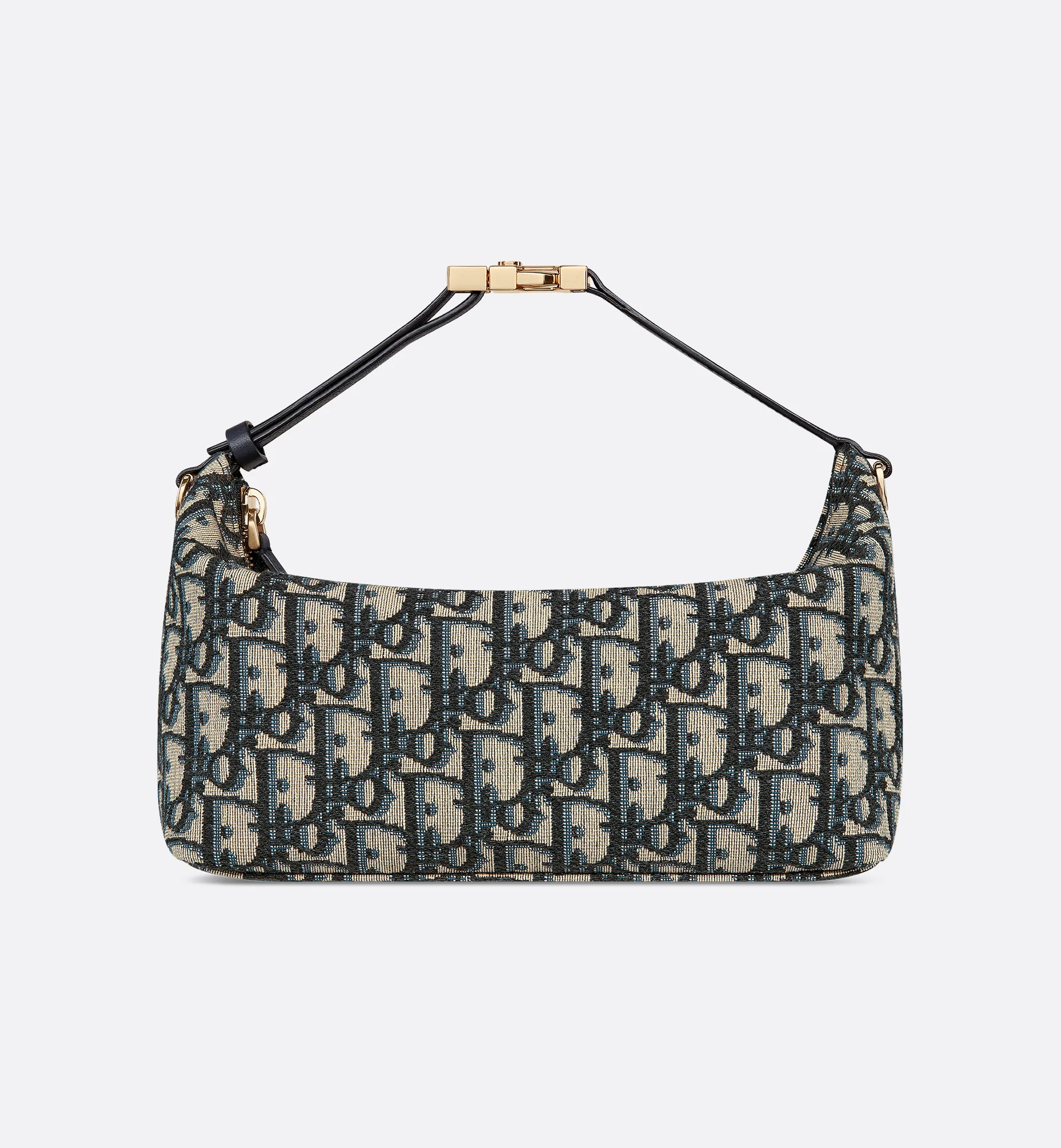 The DiorTravel Nomad pouch is a modern hybrid design. Crafted in blue Dior Oblique jacquard, it presents a spacious and flexible form that will accommodate all the essentials. The medium style can be carried by hand or worn over the shoulder thanks to the top handle, complete with a military-inspired CD buckle, while one of the House's embroidered shoulder straps can be attached to the side rings. - Zip closure - Adjustable top handle with CD buckle - Two metal rings to attach the embroidered shoulder straps and micro shoulder straps from the collection - Made in Italy Size & Fit - Dimensions: 22 x 13 x 9.5 cm / 8.5 x 5 x 3.5 inches (Length x Height x Width) - The size is suitable for a phone, a card holder, sunglasses and lipstick - Handle length: 20 – 29 cm / 8 – 11.5 inches