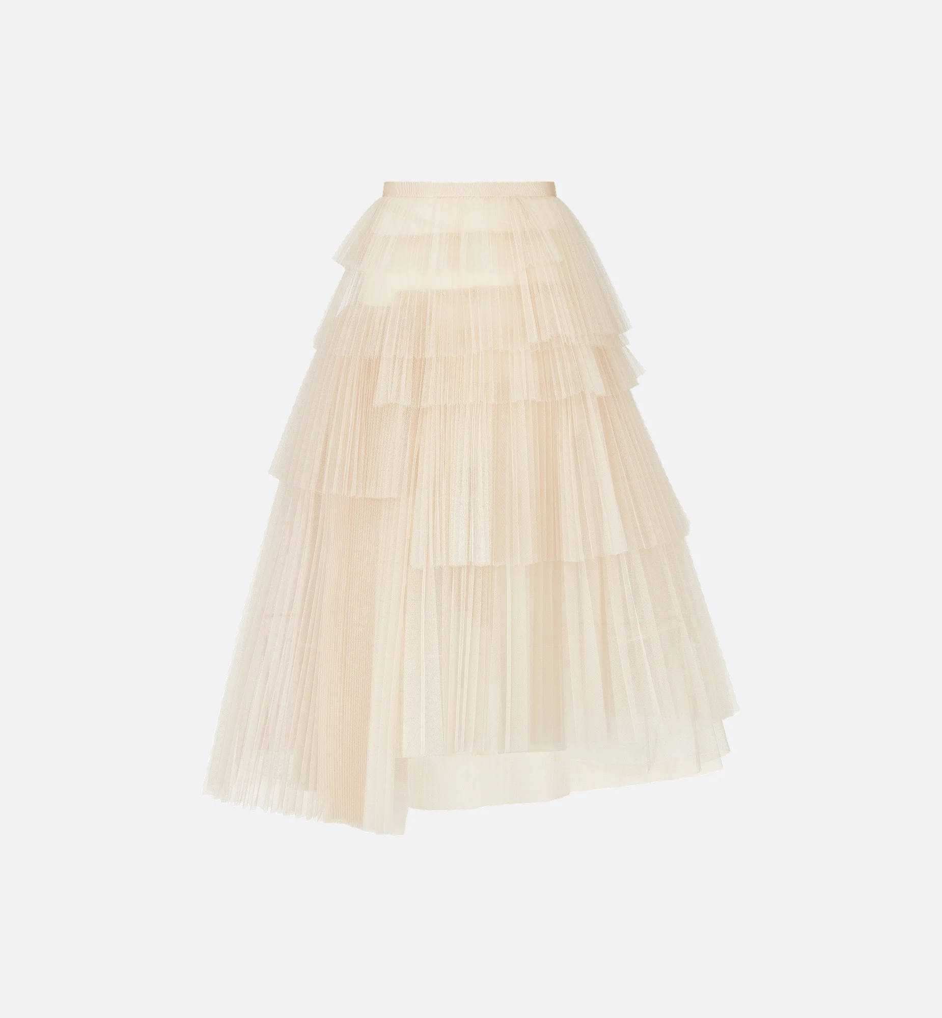 Imagined by Maria Grazia Chiuri, the mid-length skirt revisits an iconic Dior silhouette to transcend House codes of elegance. Crafted in beige tulle, it features pleated ruffles that create asymmetric volume while remaining lightweight. The sophisticated skirt can be paired with a blouse from the season for a couture look. - Side zip and hook closure - Pleated style - Removable tonal lining - 100% polyamide and lining: 100% silk - Made in Italy Size & Fit - Flared cut - High waist - Mid-length - Using our personalized tool will provide you with the best size recommendation - For more information, please review the size guide