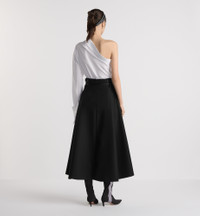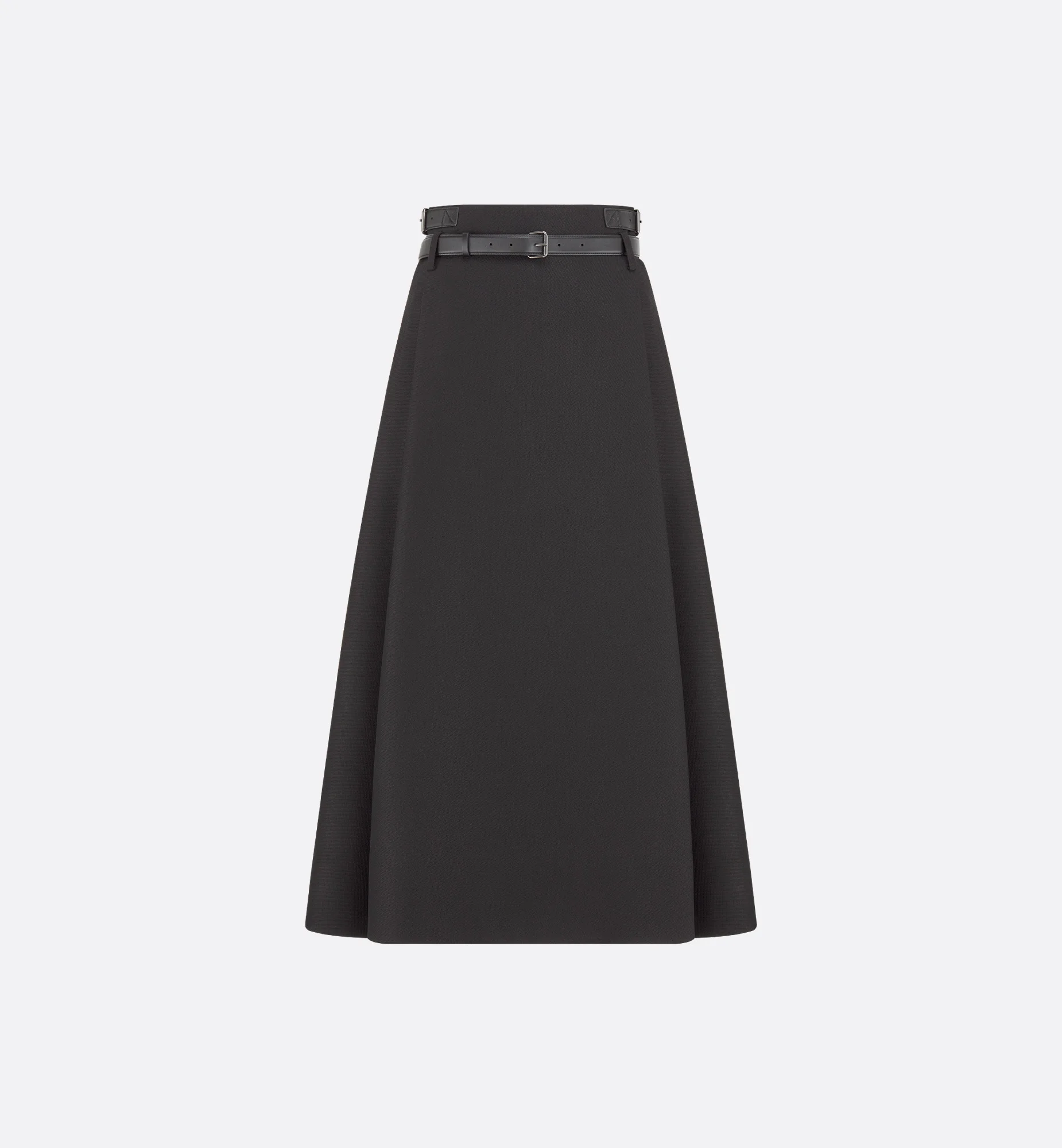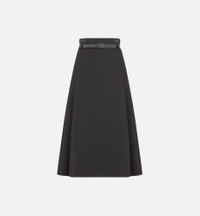 The mid-length skirt illustrates modern House elegance. Made in black virgin wool and silk grain de poudre, it is defined by its flared cut and features adjustable leather side tabs and a removable belt highlighting the waist. The skirt will pair with the matching jacket and an asymmetric shirt to complete the look. - Black leather belt with Christian Dior Paris metal buckle - Belt loops - Adjustable buckled leather tabs on the sides - Rear zip closure - Tonal lining - 78% virgin wool, 22% silk and lining: 100% silk - Made in Italy Size & Fit - Flared cut - High waist - Mid-length - The model measures 177 cm / 69.5 inches and the item shown is in size 36 (FR) - Using our personalized tool will provide you with the best size recommendation - For more information, please review the size guide