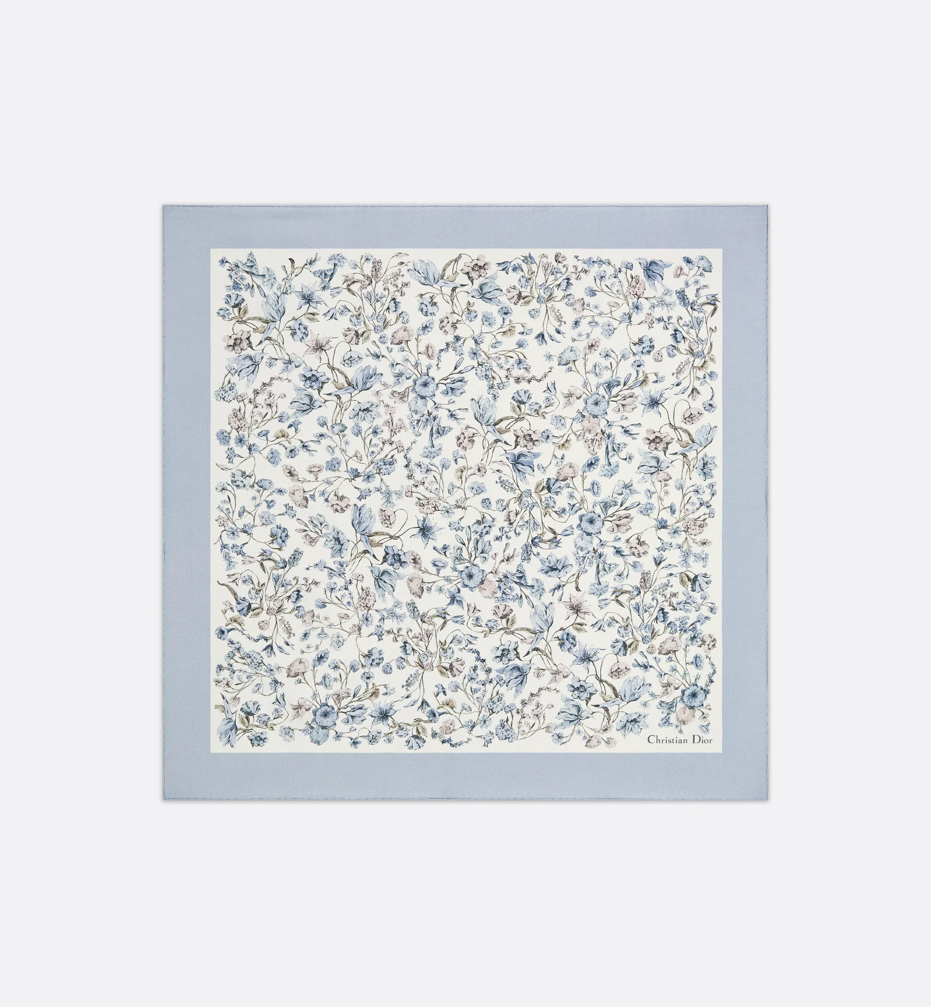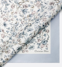 The square scarf offers a delicate pastel variation of Pietro Ruffo's Millefiori print, inspired by Baroque paintings. Crafted in white and blue silk twill, the double-sided style features hand-rolled edges and is enhanced by the Christian Dior signature. The square scarf can be worn tied around the neck or head to complete a Dior look. - White and blue double-sided Millefiori print - Christian Dior signature - Hand-rolled edges - 100% silk twill - Made in Italy Size & Fit - Dimensions: 70 x 70 cm / 27.5 x 27.5 inches (Length x Width)