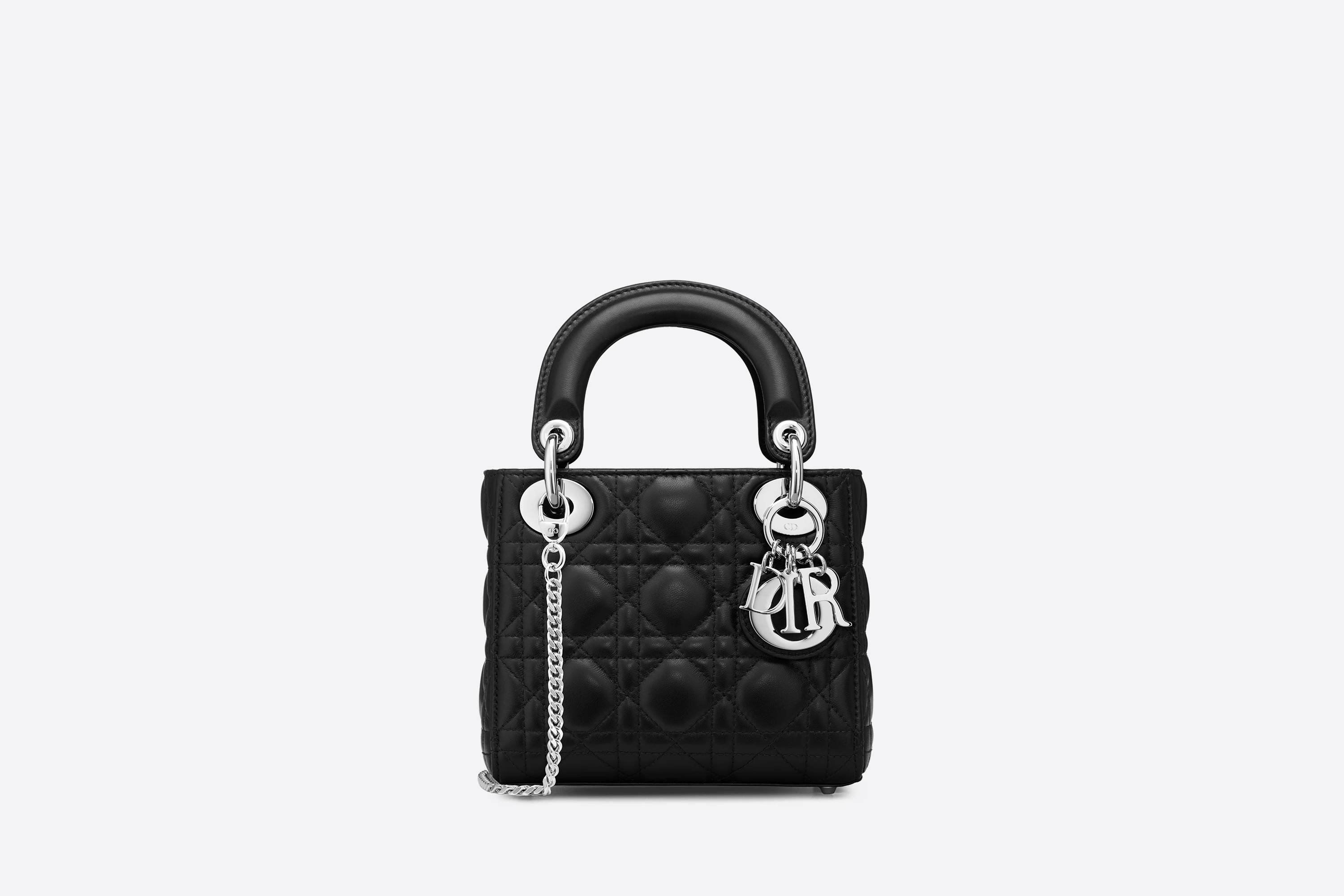 The Lady Dior handbag epitomizes the House's vision of elegance and beauty. Sleek and refined, the timeless style is crafted in black lambskin and covered with Cannage stitching, creating the instantly recognizable quilted texture. The silver-finish metal 'D.I.O.R.' charms embellish and illuminate its silhouette. Featuring a removable chain shoulder strap, the miniature Lady Dior bag can be carried by hand or worn crossbody as an ideal evening wear companion. - Removable chain strap - Interior zip pocket - The bag may be paired with different embroidered straps - Dust bag included - Made in France Size & Fit - Dimensions: 17 x 15 x 7 cm / 6.5 x 6 x 3 inches - The size is ideal for a Lotus wallet or an iPhone 13 Pro, as well as lipstick