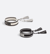 The Miss Dior bracelets feature the Miss Dior Graffiti signature on black and white cotton, offering a manifesto to Maria Grazia Chiuri's signature celebration of feminism. The bracelets are adjustable with handmade tassel cords and may be worn for any occasion, either alone or stacked. - Embroidered Miss Dior Graffiti signature on the front - Black and white cotton - Slide fastening with tassels - This set contains two bracelets - Made in Italy Size & Fit - Adjustable length: approximately 14 – 23 cm / 5.5 – 9 inches - Width: 1.5 cm / 0.5 inch