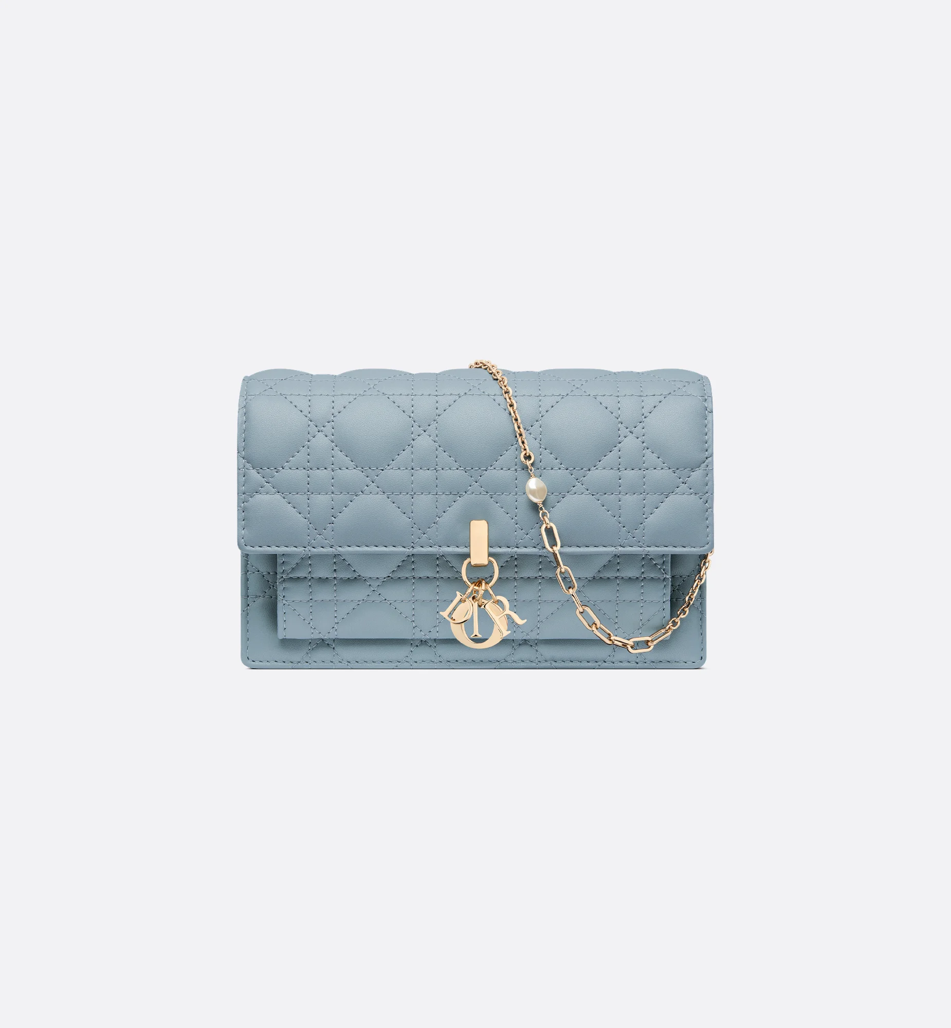 The My Dior Daily chain pouch is a compact yet spacious companion. Crafted in cloud blue lambskin with Cannage stitching, it is embellished with D.I.O.R. charms for chic and timeless appeal. Thanks to its numerous compartments, the functional accessory can accommodate all the daily essentials. Its jewel chain allows it to be worn over the shoulder or crossbody. - Front D.I.O.R. charms - Flap closure - One exterior compartment - One interior compartment - One zip pocket - One slip pocket - Six card slots - Jewel chain - Made in Italy Size & Fit - Dimensions: 19.5 x 12.5 x 5 cm / 7.5 x 5 x 2 inches (Length x Height x Width) - The size is suitable for a phone, a card holder and lipstick