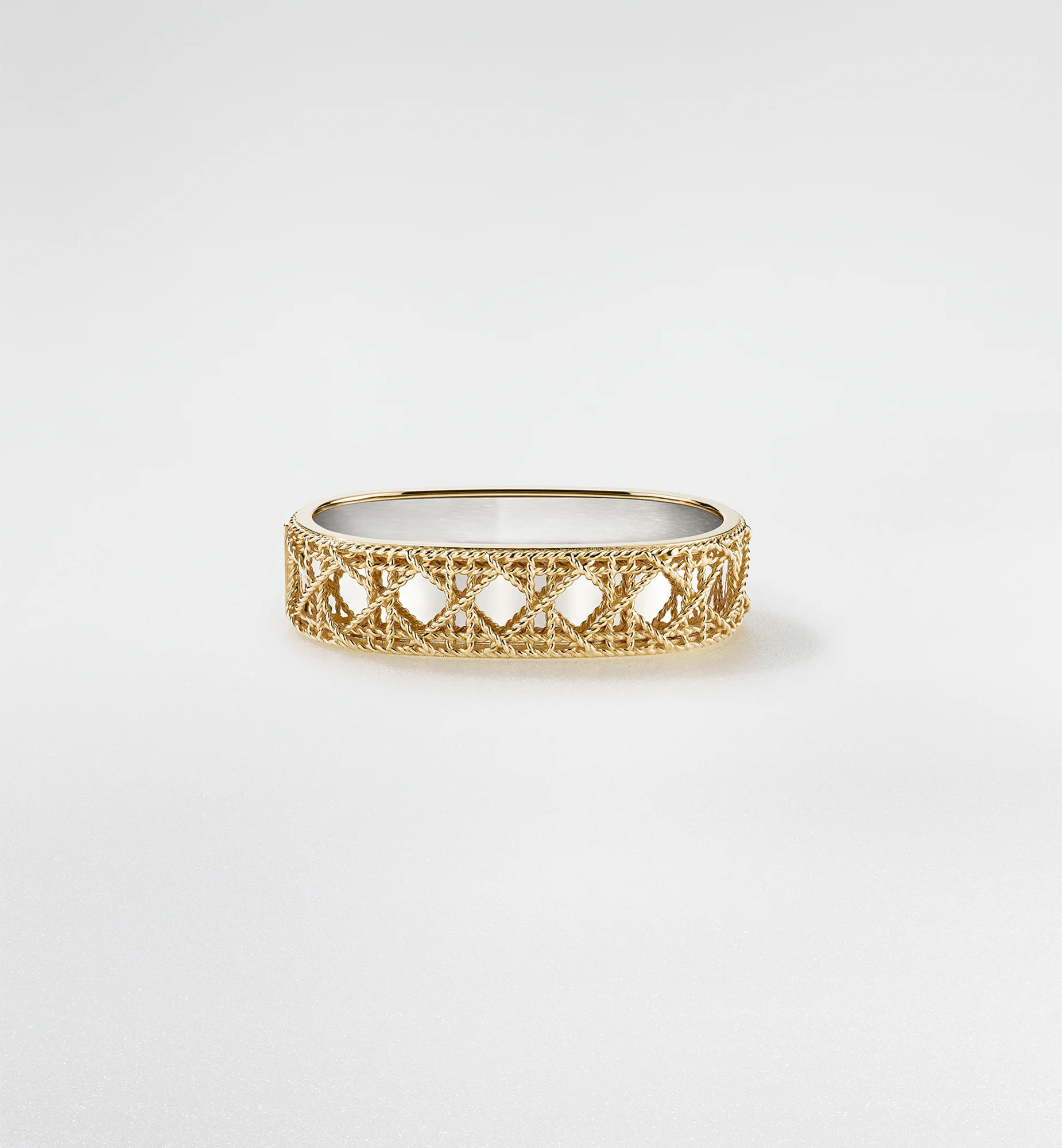 The My Dior collection by Victoire de Castellane is reinvented with a series of infinitely precious jewelry pieces. In an ode to the art of detail, a tangle of golden threads is woven together like meticulously interlaced sprigs of straw into a subtle mesh, revealing the iconic Cannage, accented by a strip of shiny gold. The craftsmanship is an homage to Dior's refined style. Combining shades of gold, the My Dior design highlights the radiance of white gold, while the iconic Cannage lines appear in yellow gold for a luminous and quintessential Dior style. - 18K yellow gold and 18K white gold Size & Fit - You may refer to the size guide on the website - For more information on sizing, we invite you to visit a boutique - We recommend styling My Dior rings together to create a unique look. The ring also pairs well with other creations from the My Dior collection