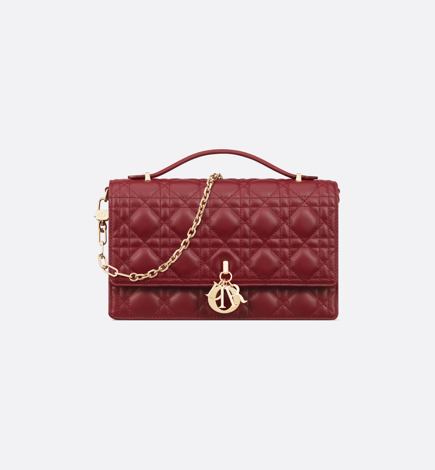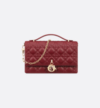 The My Dior Top Handle bag presents an elegant and functional design. The bag is crafted in cherry red lambskin with Cannage stitching and features a flap enhanced by D.I.O.R. charms as well as two compartments and a zip pocket to accommodate all the essentials, day or night. The signature top handle is completed by a removable chain strap with a leather insert, allowing it to be comfortably carried by hand, worn over the shoulder or crossbody. - Main composition: lambskin - Lambskin lining - Front D.I.O.R. charms - Flap closure - Two interior compartments with a zip pocket - Rear slip pocket - Leather top handle - Adjustable and removable chain shoulder strap with leather insert - Dust bag included - Made in Italy Size & Fit - Dimensions: 24 x 15 x 6.5 cm / 9.5 x 6 x 2.5 inches (Length x Height x Width) - The size is suitable for a wallet, phone and lipstick - Strap length: 102 – 117 cm / 40 – 46 inches - Drop length: 48.5 – 55.5 cm / 19 – 22 inches - Top handle length: 21 cm / 8.5 inches - Weight: 670 g / 23.5 ounces - Size and weight details may vary depending on the product's material
