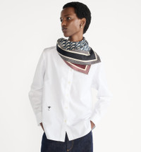 The Dior Oblique Diortwin square scarf highlights the iconic House motif with a two-tone double-sided variation. Crafted in silk twill, the design has hand-rolled edges with one burgundy side and a navy blue one, both embellished with a tonal 'CHRISTIAN DIOR' signature jacquard band. The scarf can be tied at the neck or head to complete the Dior look. - Burgundy and navy blue Diortwin with double-sided Dior Oblique motif - Tonal jacquard band with 'CHRISTIAN DIOR' signature - Hand-rolled edges - 100% silk twill - Made in Italy Size & Fit - Dimensions: 90 x 90 cm / 35.5 x 35.5 inches