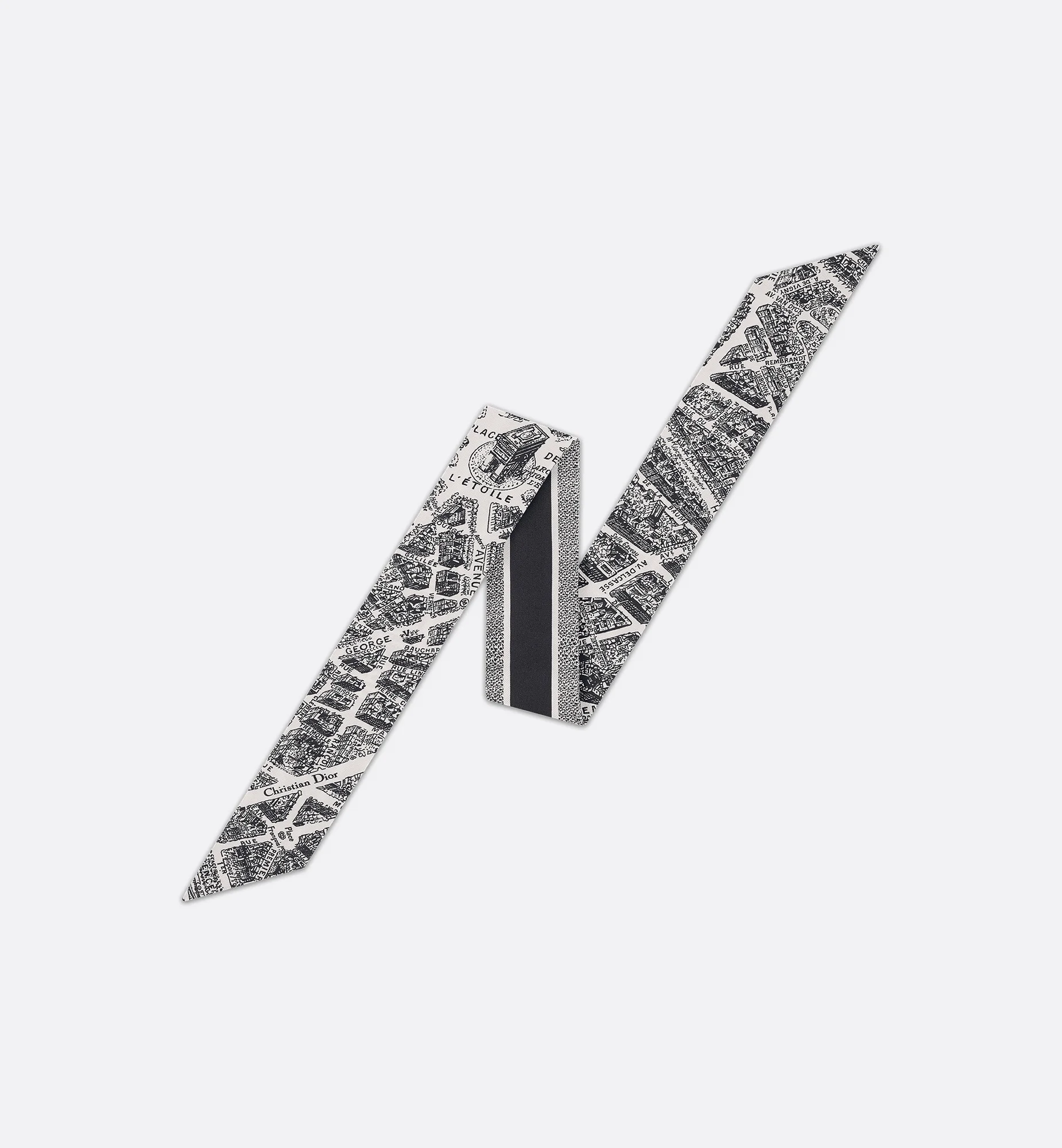 The white and black silk twill Mitzah scarf showcases the hallmark Plan de Paris motif, inspired by House archives and centered around Dior's historic address on Avenue Montaigne. A timeless style, its elongated shape and pointed ends are embellished with a contrasting Christian Dior signature jacquard band on the back. The Mitzah scarf will lend the finishing touch to any modern look and may be tied around the neck, at the wrist or on a bag. - White and black Plan de Paris print - Christian Dior signature - Contrasting jacquard band with Christian Dior signature on back - Pointed ends - 100% silk twill - Made in Italy Size & Fit - Dimensions: 6 x 105 cm / 2.5 x 41.5 inches
