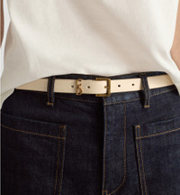 New for Fall 2025, the Saddle Loop belt pays elegant homage to the House's hallmark namesake bag. Made in light ivory smooth calfskin, it features a CD pin buckle elevated by a CD signature belt loop honoring Saddle codes. The belt will lend a refined and timeless touch to a Bar jacket, a dress or jeans. - CD pin buckle - Saddle CD signature belt loop - Christian Dior Paris signature on the interior - Antique gold-finish metal detailing - 80% calfskin, 20% brass - Made in Italy Size & Fit - Width: 20 mm / 0.8 inch - Buckle dimensions: 2.3 x 2.8 cm / 1 x 1.25 inches (Length x Height) - Using our personalized tool will provide you with the best size recommendation - For more information, please review the size guide