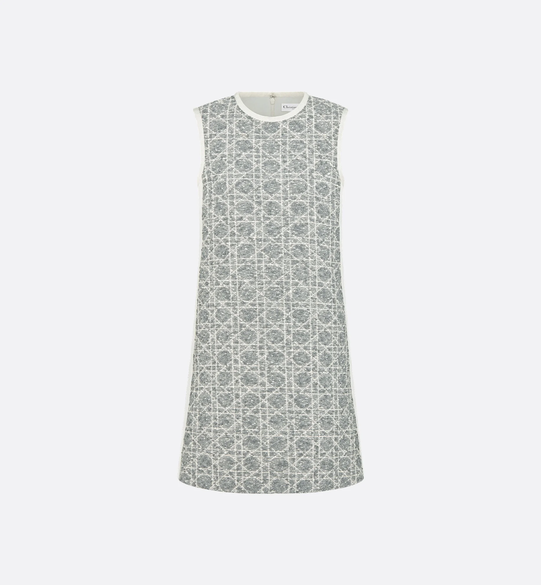 The short dress offers a modern take on Dior's codes of elegance. Crafted in cotton-blend tweed with a gray Macrocannage motif, it features a short, regular-fit silhouette embellished with tonal grosgrain detailing. The sleeveless dress will create a refined contemporary look. - Rear zip closure - Grosgrain details - Lining - 56% cotton, 28% acrylic, 16% polyamide and lining: 100% silk - Made in Italy Size & Fit - Slightly flared cut - Short silhouette - Sleeveless - The model measures 178 cm / 70 inches and the item shown is in size 36 (FR) - Using our personalized tool will provide you with the best size recommendation - For more information, please review the size guide