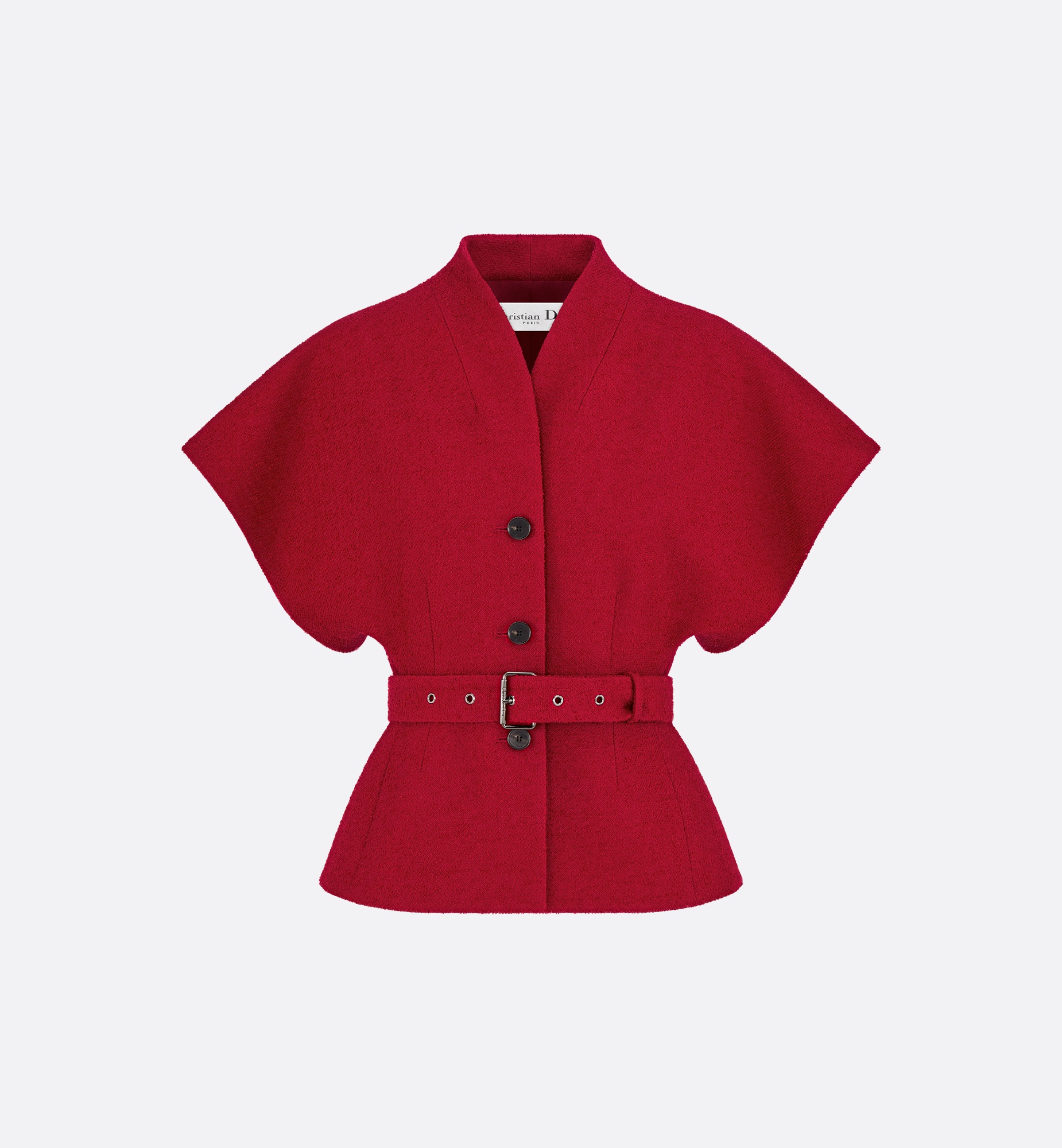 The jacket is an elegant and modern creation. Crafted in red virgin wool- and cotton-blend boucle, it features a short silhouette enhanced by short wide sleeves and a collar without lapels inspired by the House archives. Completed by a tonal belt gracefully highlighting the waist, the jacket can be paired with the matching skirt for a resolutely Dior look. - Tonal belt - Front button closure - Christian Dior Paris horn buttons - Tonal lining - 70% virgin wool, 23% cotton, 7% polyamide and lining: 100% silk - Made in Italy Size & Fit - Regular fit - Short wide sleeves - Using our personalized tool will provide you with the best size recommendation - For more information, please review the size guide