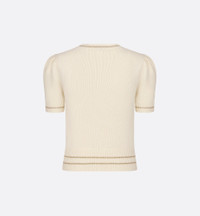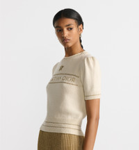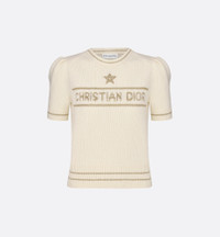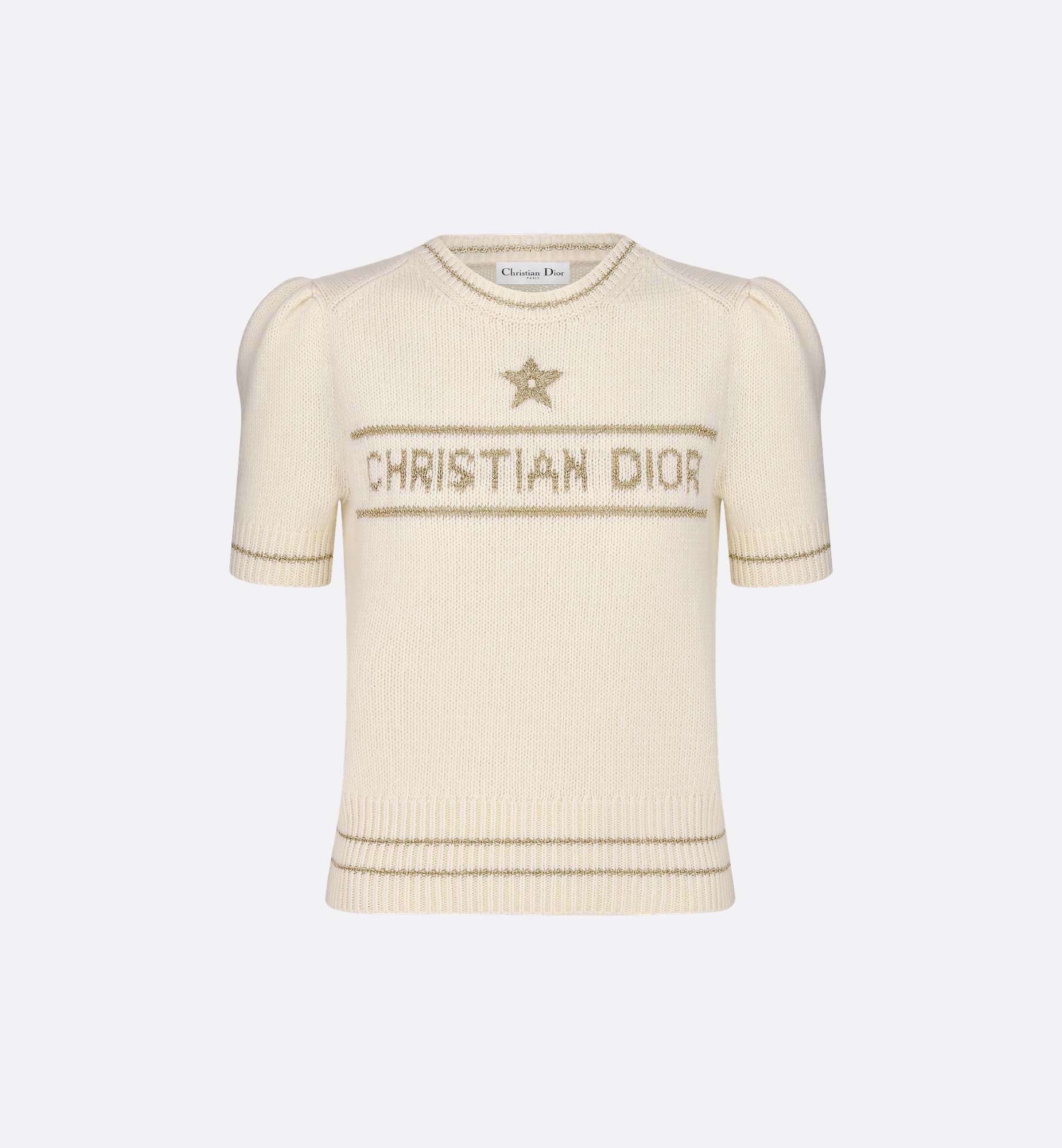 The sweater combines modernity and elegance. Delicately crafted in a gold-tone blended virgin wool and cashmere knit embroidered with gold-tone metallic thread, it highlights the House's lucky star and the Christian Dior signature, both embroidered by hand. The slightly puffed short sleeves and ribbed details complete the sweater, which can be coordinated with one of the season's mid-length skirts. - Embroidered Christian Dior signature and star - Ribbed neckline, hem and sleeve hems - 66% virgin wool, 28% cashmere, 3% viscose, 1% elastane, 1% polyamide, 1% polyester (5 gauge)* - Made in Italy - Treat with extra care and gently dry clean Size & Fit - Fitted straight cut - Short puff sleeves - Using our personalized tool will provide you with the best size recommendation - The model measures 178 cm / 70 inches and the item shown is in size 36 (FR) - For more information, please review the size guide