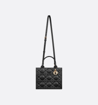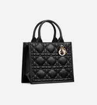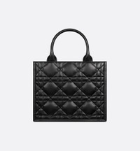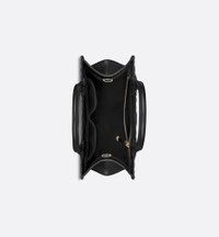 Maria Grazia Chiuri's hallmark Dior Book Tote is offered in an elegant variation. Crafted in black calfskin, the design showcases the Macrocannage motif and is embellished with pale gold-finish metal D.I.O.R. charms on one of the top handles. The cashmere leather interior reveals a zip pocket and slip pockets, ideal for organizing all the daily essentials. Featuring an adjustable and removable strap, the lightweight and practical small tote is a prime example of Dior savoir-faire and may be carried by hand or worn over the shoulder. - Adjustable and removable leather shoulder strap - Interior zip pocket - Two interior slip pockets - Dust bag included - Made in Italy Size & Fit - Dimensions: 26.5 x 22 x 14 cm / 10.5 x 8.5 x 5.5 inches (Length x Height x Width) - Strap length: 103 – 117 cm / 40.5 – 46 inches - Drop length: 49.5 – 57.5 cm / 19.5 – 22.5 inches - Top handle length: 32 cm / 12.5 inches - Top handle drop length: 12 cm / 4.5 inches - Weight: 735 g / 26 ounces