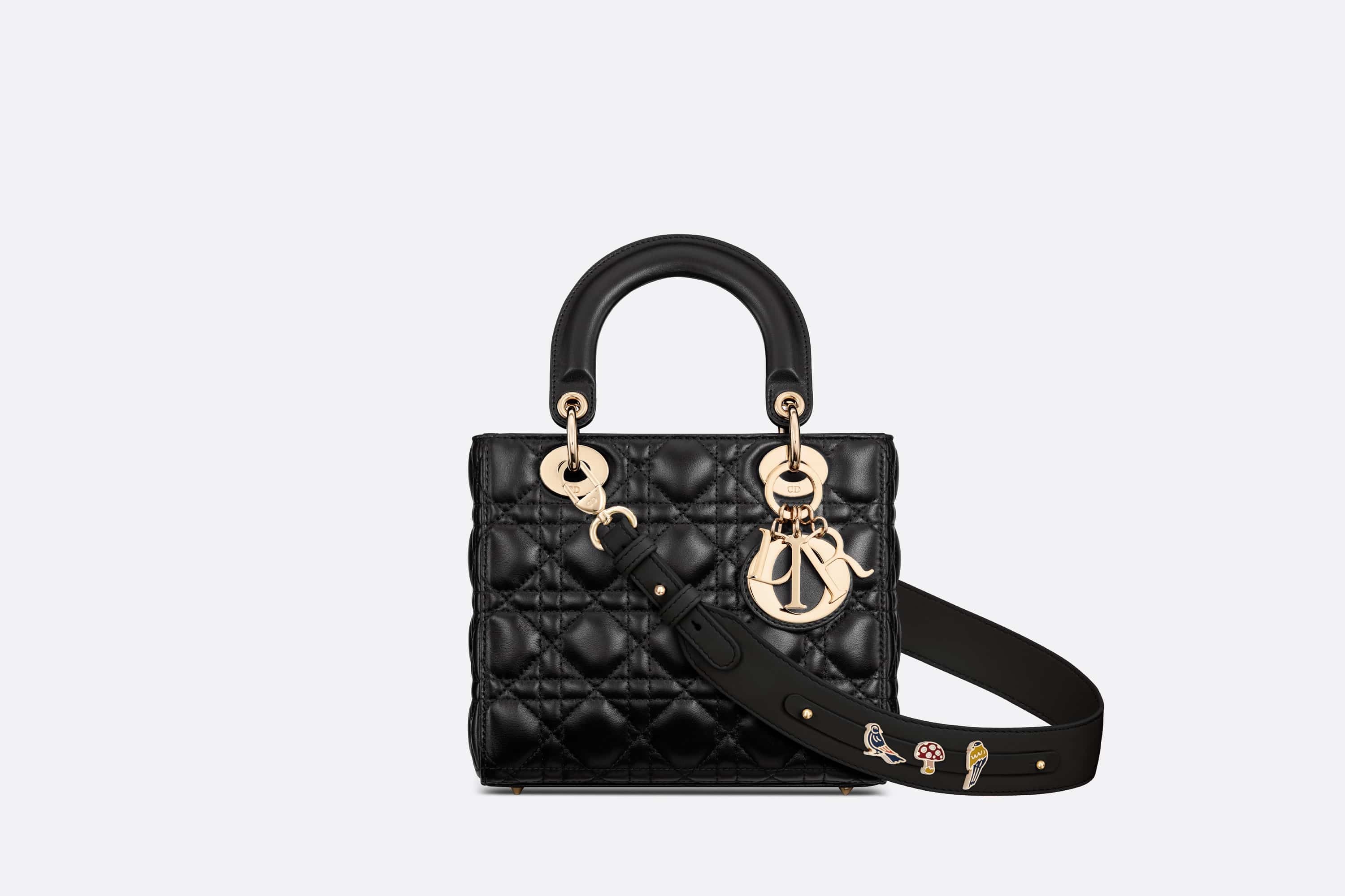 The Lady Dior My ABCDior bag epitomizes Dior's vision of elegance and beauty. Sleek and refined, the timeless style is crafted in black lambskin with Cannage stitching, creating the instantly recognizable quilted texture. Pale gold-finish metal D.I.O.R. charms offer elegant appeal. Featuring a shoulder strap that can be personalized with badges, the small, unique design may be carried by hand or worn crossbody. - Wide, adjustable and customizable shoulder strap with three badges included. The shoulder strap can accommodate up to six badges in total. - Interior zip pocket and patch pocket - The bag may be paired with the House's different embroidered straps - Dust bag included - Made in Italy Size & Fit - Dimensions: 20 x 17 x 8 cm / 8 x 6.5 x 3 inches (Length x Height x Width) - The size is suitable for a wallet, a phone and sunglasses - Strap length: 112 - 116 cm / 44 - 45.5 inches - Drop length: 56 - 58 cm / 22 - 23 inches - Weight: approximately 810 g / 28.5 ounces