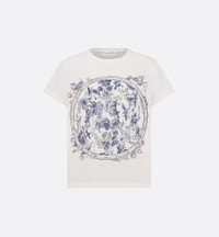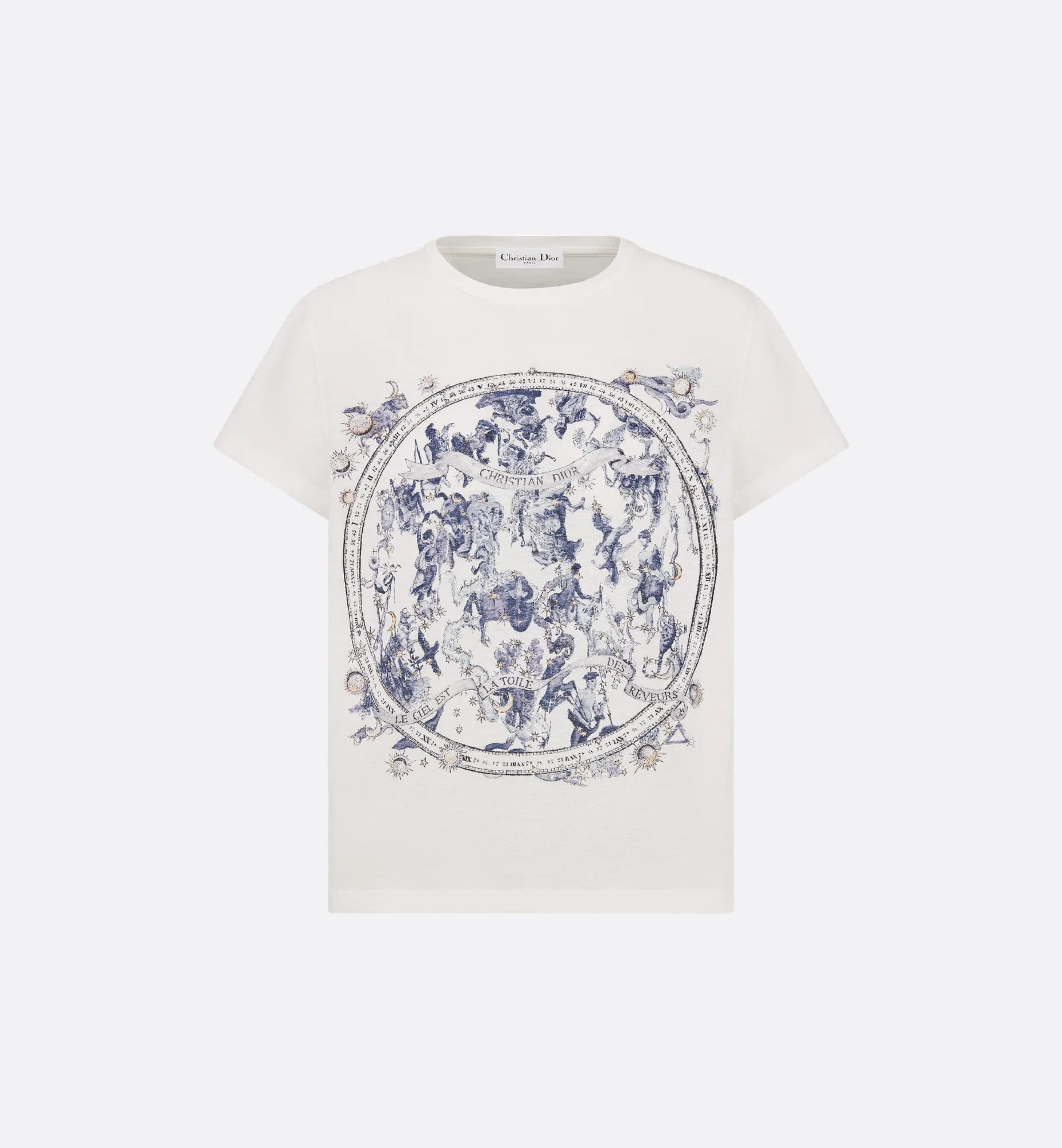 The T-shirt presents Pietro Ruffo's Dior Night of Dreams motif in blue, featuring a night sky filled with sea animals, winged horses and mythological figures, as well as the quote 'Le ciel est la toile des reveurs' (The sky is a canvas for dreamers), and a frieze embellished with zodiac signs. Made in ecru cotton and linen jersey, it has a regular fit and crew neck. The T-shirt can be paired with other Dior Night of Dreams creations. - Unlined - 85% cotton, 15% linen - Made in Italy - Treat with extra care and gently dry clean Size & Fit - Regular fit - Short sleeves - Using our personalized tool will provide you with the best size recommendation - For more information, please review the size guide