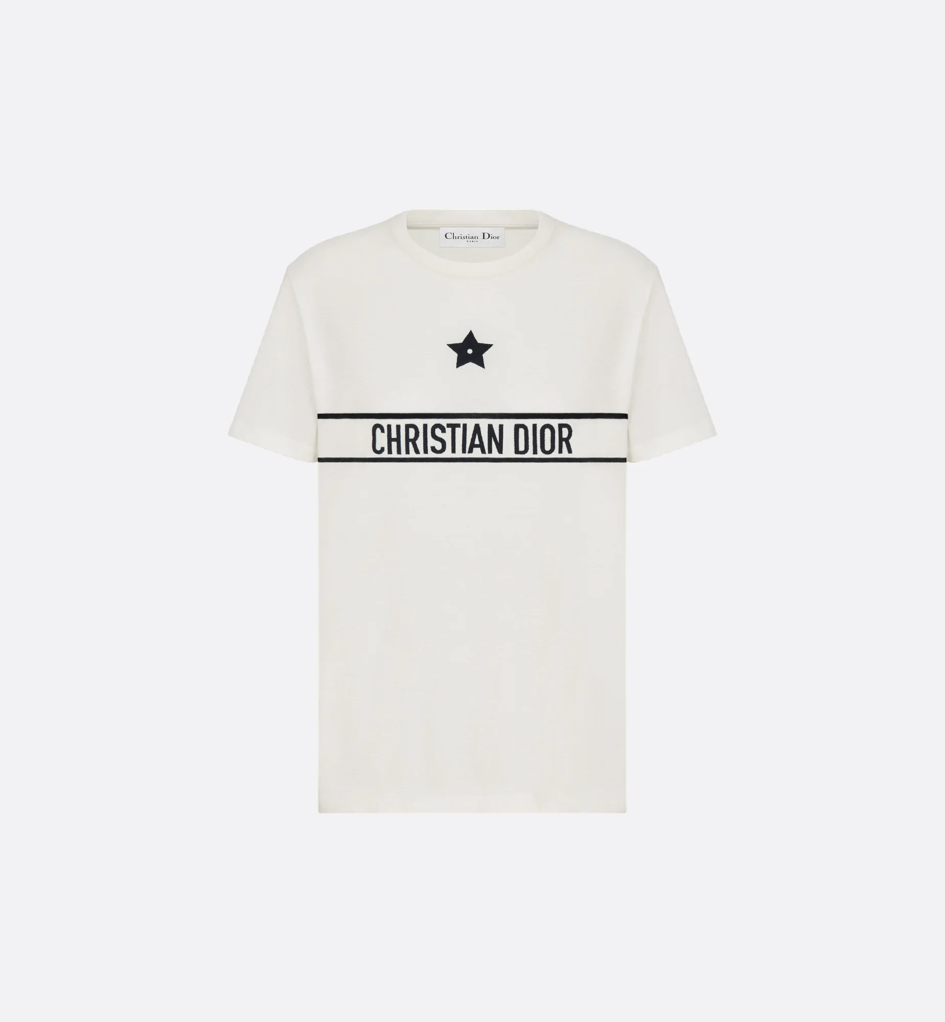 The T-shirt celebrates elements of sportswear with the House's couture spirit. Crafted in white cotton jersey, it features a Christian Dior signature band and lucky star on the front. The T-shirt can be worn with any outfit, in any season. - Christian Dior signature band and star on the front - Crew neck - 100% cotton - Made in Italy Size & Fit - Regular fit - Back length: 63 cm / 25 inches (size S) - Short sleeves - For more information, please review the size guide