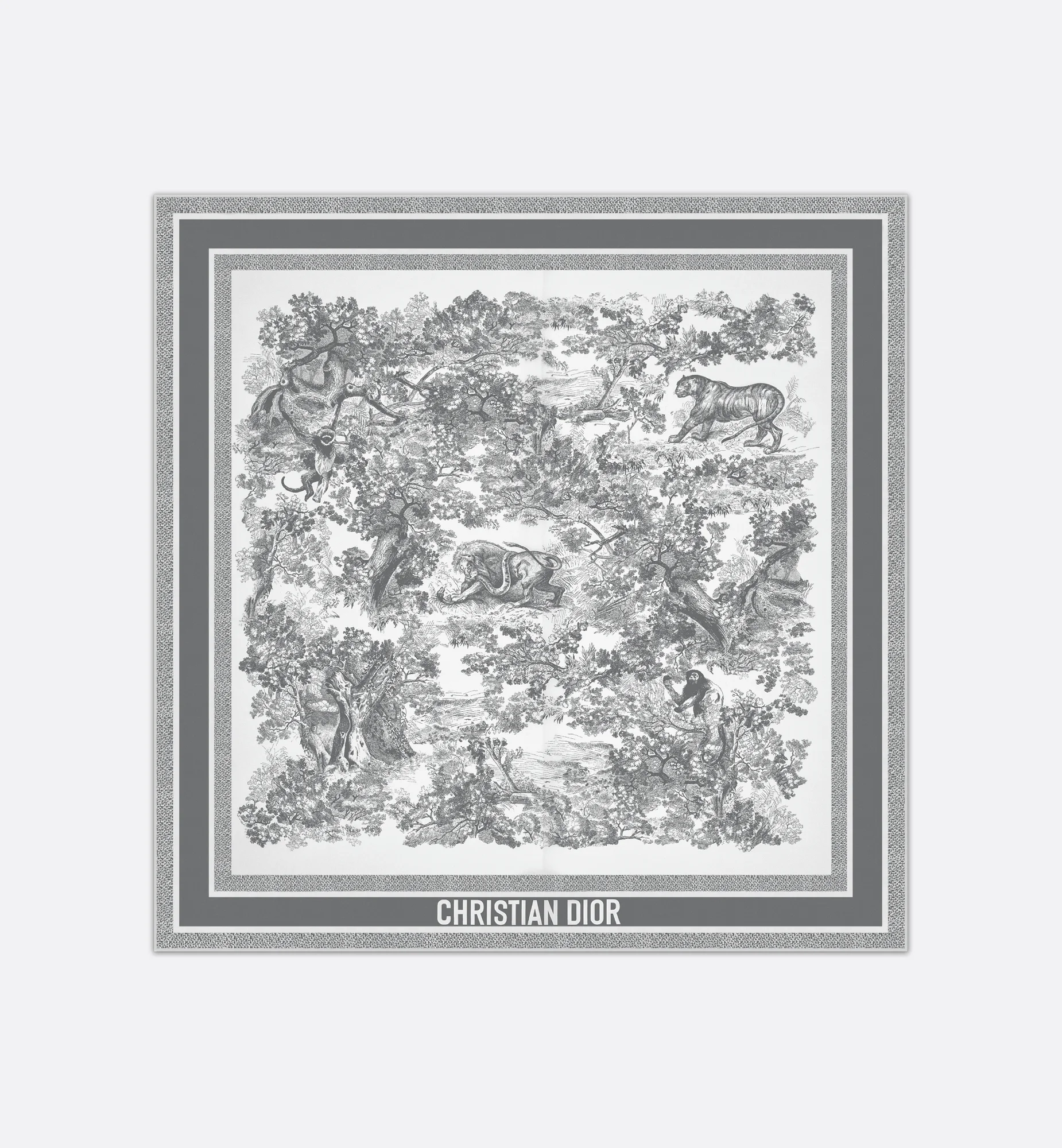 The Toile de Jouy Sauvage square scarf honors the hallmark House motif. Crafted in ivory and gray silk twill, the design has hand-rolled edges and is embellished with a contrasting 'CHRISTIAN DIOR' signature jacquard band. The scarf may be tied around the neck or head to complete a Dior look. - Ivory and gray Toile de Jouy motif - Contrasting jacquard band with 'CHRISTIAN DIOR' signature - Hand-rolled edges - 100% silk twill - Made in Italy Size & Fit - Dimensions: 90 x 90 cm / 35.5 x 35.5 inches